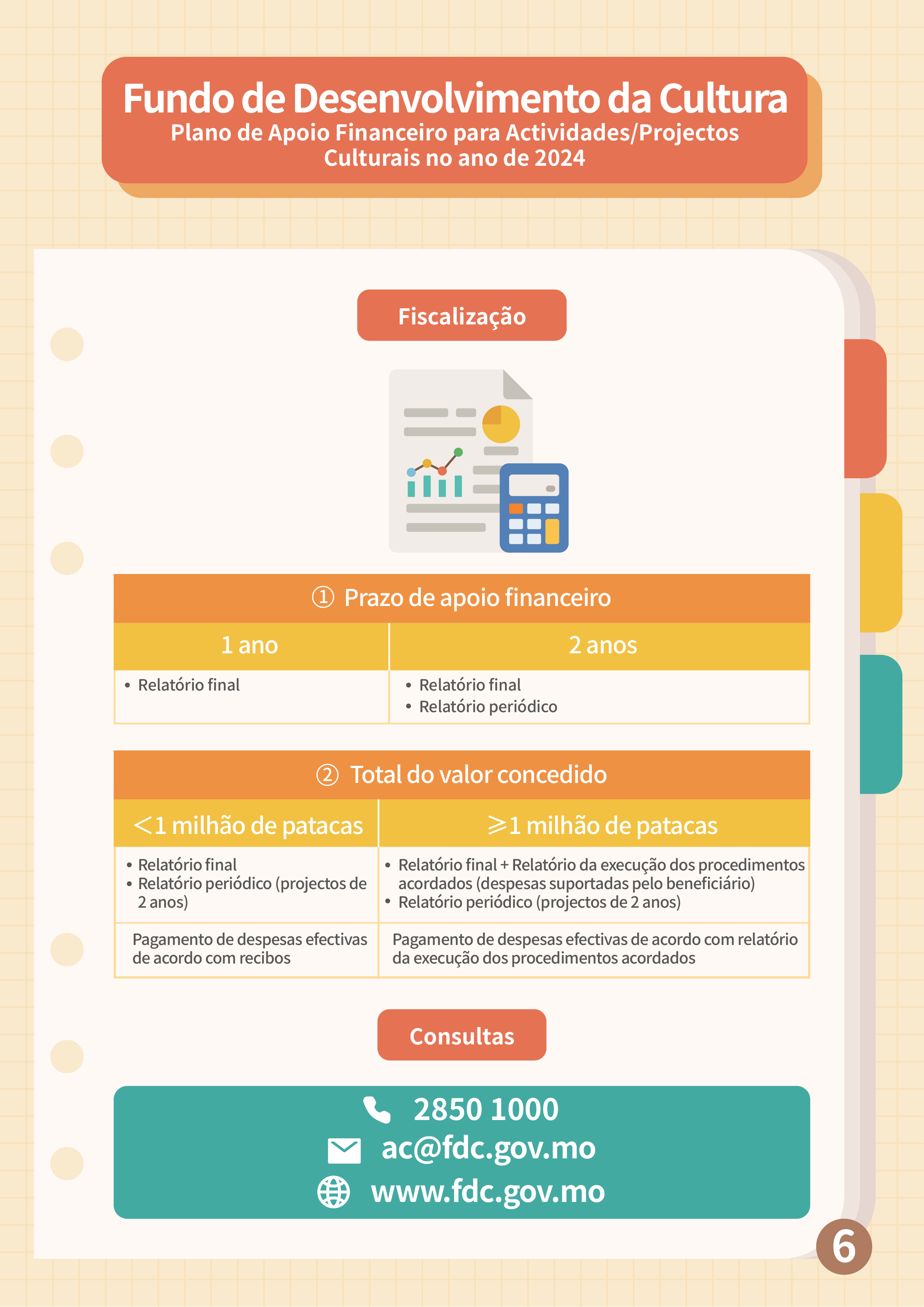 Os candidatos dos dois planos acima referidos devem aceder ao Sistema de Candidatura Online do FDC, através da “Conta Única de Macau”, para preencher o boletim de candidatura e carregar os documentos necessários. A fim de apresentar as informações detalhadas sobre o “Plano de apoio financeiro para actividades/projectos culturais no ano de 2024” e responder às perguntas dos candidatos, o FDC realizará uma sessão de esclarecimento no dia 6 de Setembro, às 15h00, no salão de convenções do Centro de Ciência de Macau, podendo os interessados inscrever-se na página electrónica do FDC (www.fdc.gov.mo). Para quaisquer consultas, é favor de contactar-nos através do telefone, n.º 8985 0862 ou por email, karenchoi@fdc.gov.mo.
