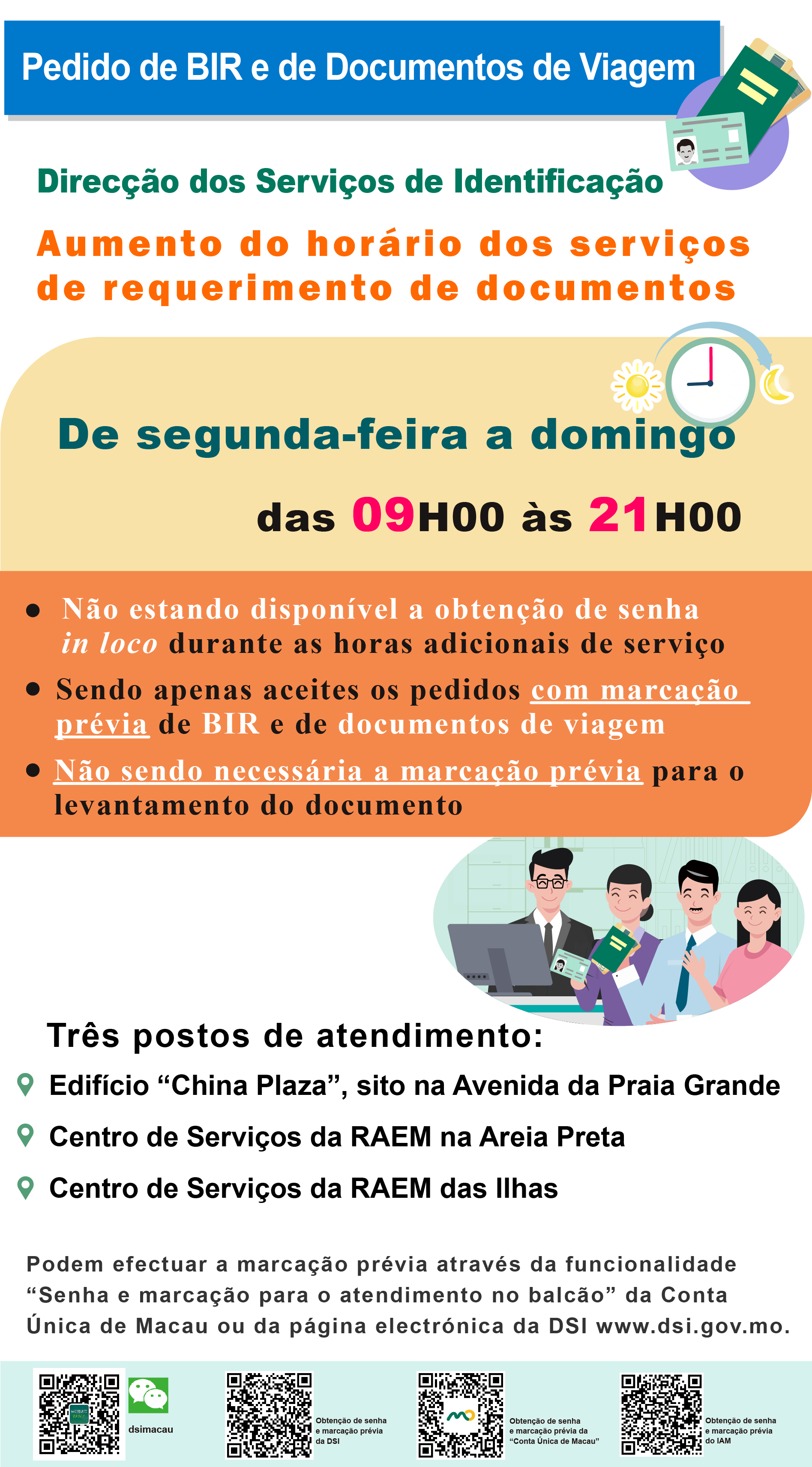 Actualmente, o horário diário de serviço dos três postos de atendimento da DSI, sitos, respectivamente, no Edifício China Plaza na Avenida da Praia Grande, no Centro de Serviços da RAEM na Areia Preta e no Centro de Serviços da RAEM das Ilhas é prolongado até às 21H00, e mantêm em funcionamento aos Sábados e Domingos, com o objectivo de prestar ao público um serviço ininterrupto de requerimento de documentos, durante 7 dias por semana, das 09H00 às 21H00.