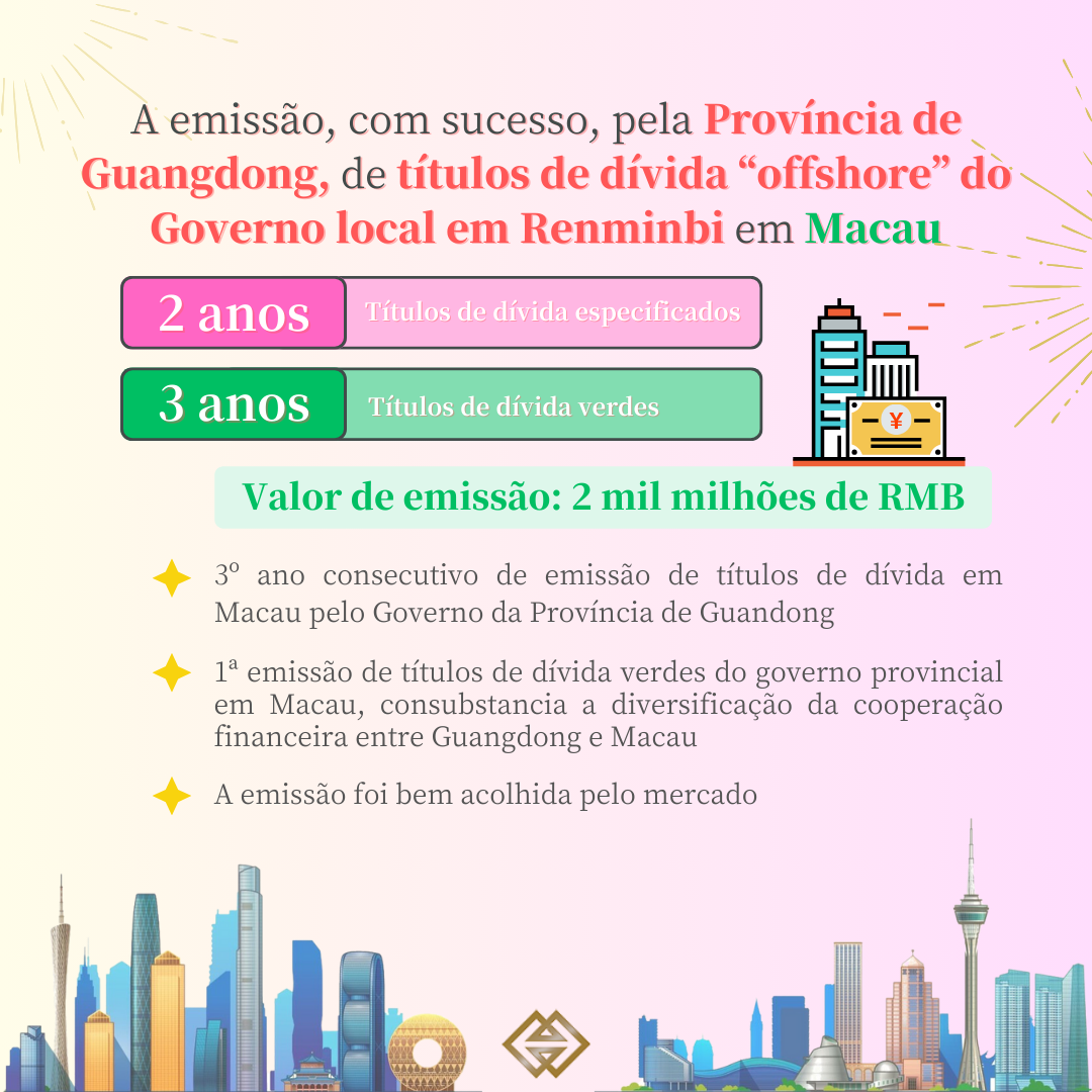 Esta emissão destina-se a investidores profissionais, envolvendo um valor de dois mil milhões de Renminbi. Entre estes, mil milhões de RMB dos títulos de dívida foram emitidos sob a forma de obrigações especificadas, com prazo de dois anos e uma taxa de juro de 2,4%, enquanto que os outros mil milhões de RMB dos títulos de dívida foram emitidos na forma de obrigações verdes, com prazo de três anos e uma taxa de juro de 2,55%, tendo obtido o “Green Finance Pre-issuance stage certification”, emitido pela “Hong Kong Quality Assurance Agency”. A presente emissão de títulos de dívida do Governo local de Guangdong foi bem acolhida pelo mercado, tendo registado uma subscrição de 2,3 vezes, alcançando assim um resultado satisfatório.