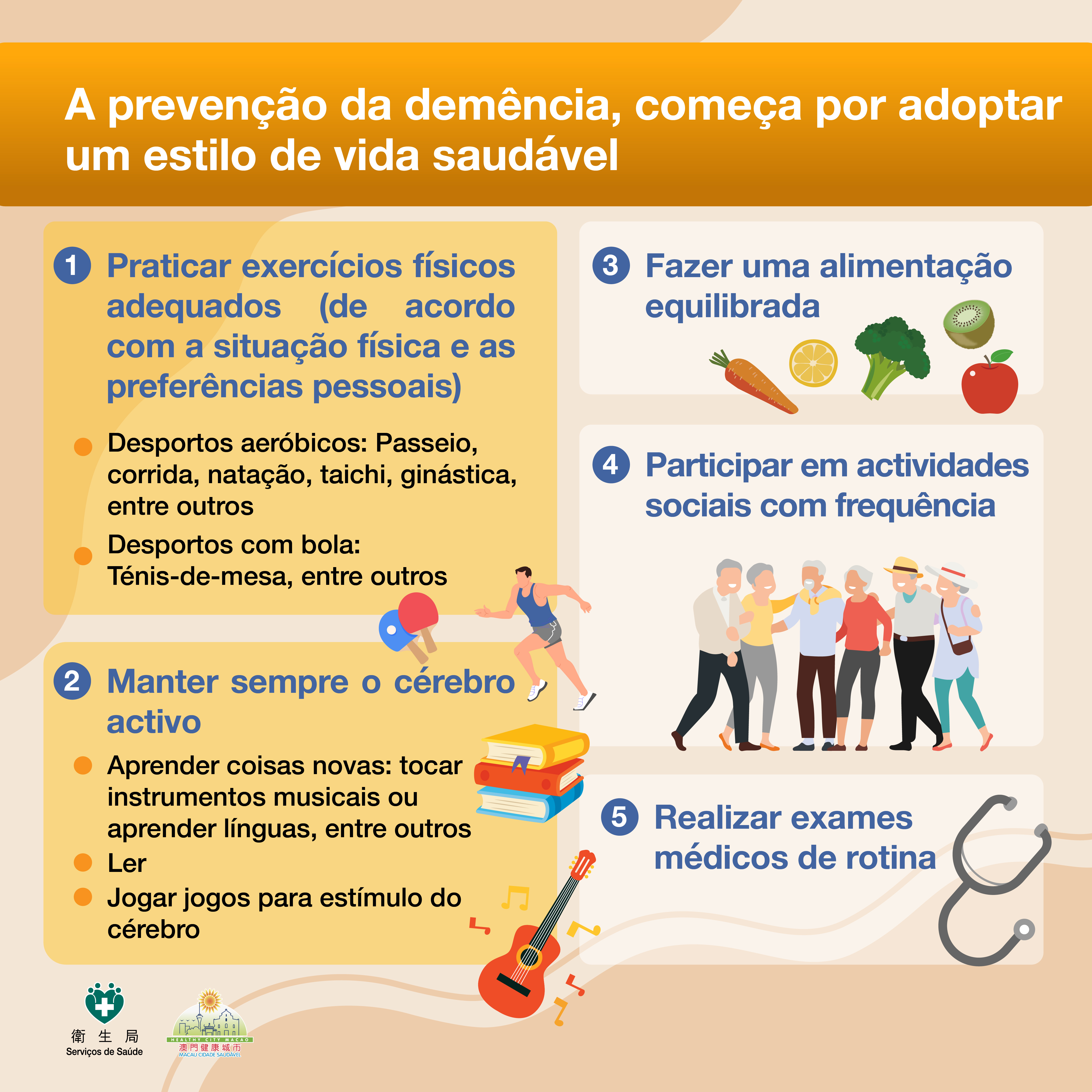 Em resposta às acções de divulgação do Mês Mundial do Alzheimer, os Serviços de Saúde têm vindo a realizar trabalhos de divulgação e educação através de diferentes meios de comunicação social, com o objectivo de permitir aos residentes conhecerem correctamente a demência. O Grupo de Cuidados de Enfermagem para Idosos da Área de Cuidados de Saúde Comunitários dos Serviços de Saúde, destacou profissionais de saúde ao Colégio da Ilha Verde, ao Colégio Diocesano de São José (3) e à Escola Fong Chong da Taipa para realizarem actividades promocionais sobre a demência, nomeadamente, palestras, filmes de curta-metragem e jogos cerebrais, entre outros, reforçando os conhecimentos dos alunos e professores sobre a demência e a sua atenção; O Centro de Avaliação e Tratamento da Demência e a Linha aberta de Apoio para a Saúde dos Idosos organizaram, em conjunto, as actividades destinadas aos idosos, doentes com demência e seus familiares, permitindo-lhes manter a participação comunitária e o intercâmbio e a partilha de experiências. O Grupo de Trabalho de Prevenção e Controlo da Doença de Alzheimer da Comissão de Prevenção e Controlo das Doenças Crónicas continua a promover a construção de uma comunidade amiga da demência em Macau, a reforçar os laços de cooperação entre a comunidade médica e a sociedade, a unir os esforços com a comunidade e as escolas. No futuro, o mesmo Grupo de Trabalho em conjunto com o Instituto de Acção Social (IAS) e a Associação da Doença de Alzheimer de Macau, irão convidar mais entidades a participar no Programa da Carta, no sentido de fortalecer a Grande Aliança Amiga da Demência, esperando-se que as informações relacionadas com a doença de demência possam ser divulgadas a mais grupos diferenciados da sociedade. Além disso, no corrente ano, foram produzidas as infografias sobre a “prevenção da demência” e a “detecção precoce de doentes com demência”, para que o público possa conhecer a situação e as necessidades dos doentes com demência, bem como compreender e apoiar os doentes e os seus cuidadores, de forma a permitir a sua participação na sociedade, a sua integração social e a manutenção da qualidade de vida.