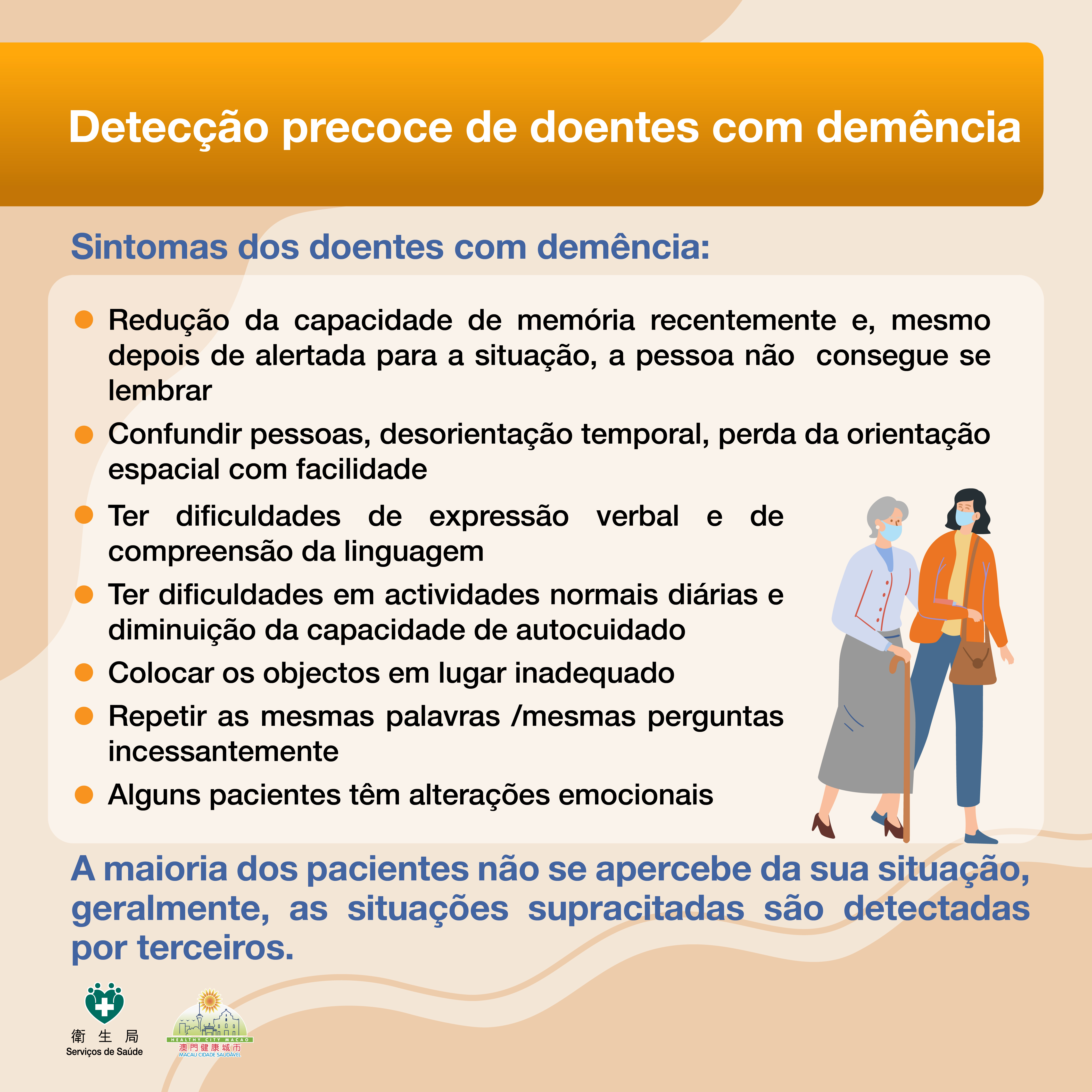 Para mais informações sobre a demência, consulte a página electrónica da Comunidade amiga das pessoas com demência de Macau (https://www.ssm.gov.mo/mdfc/).