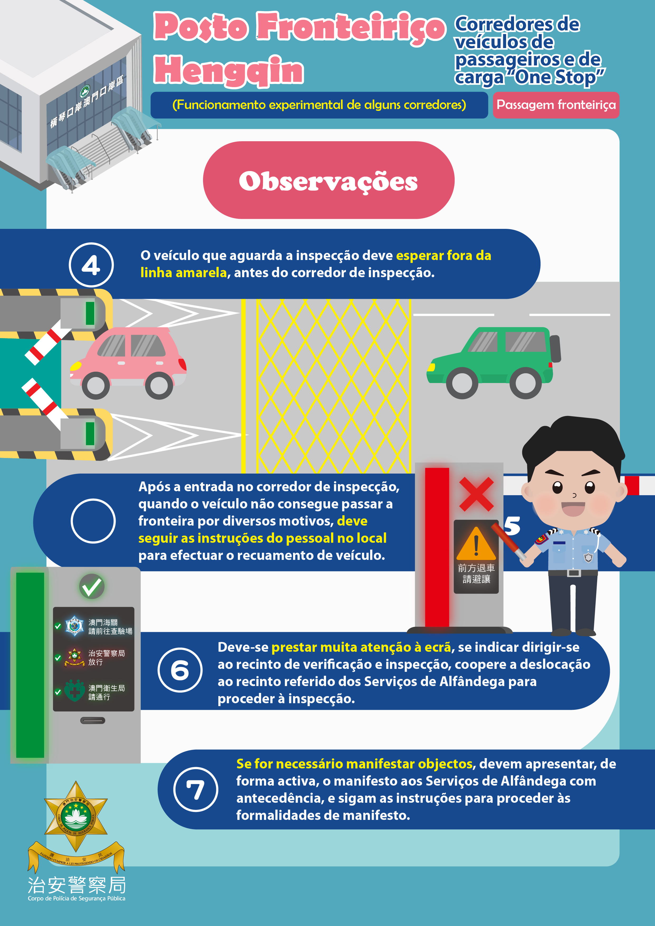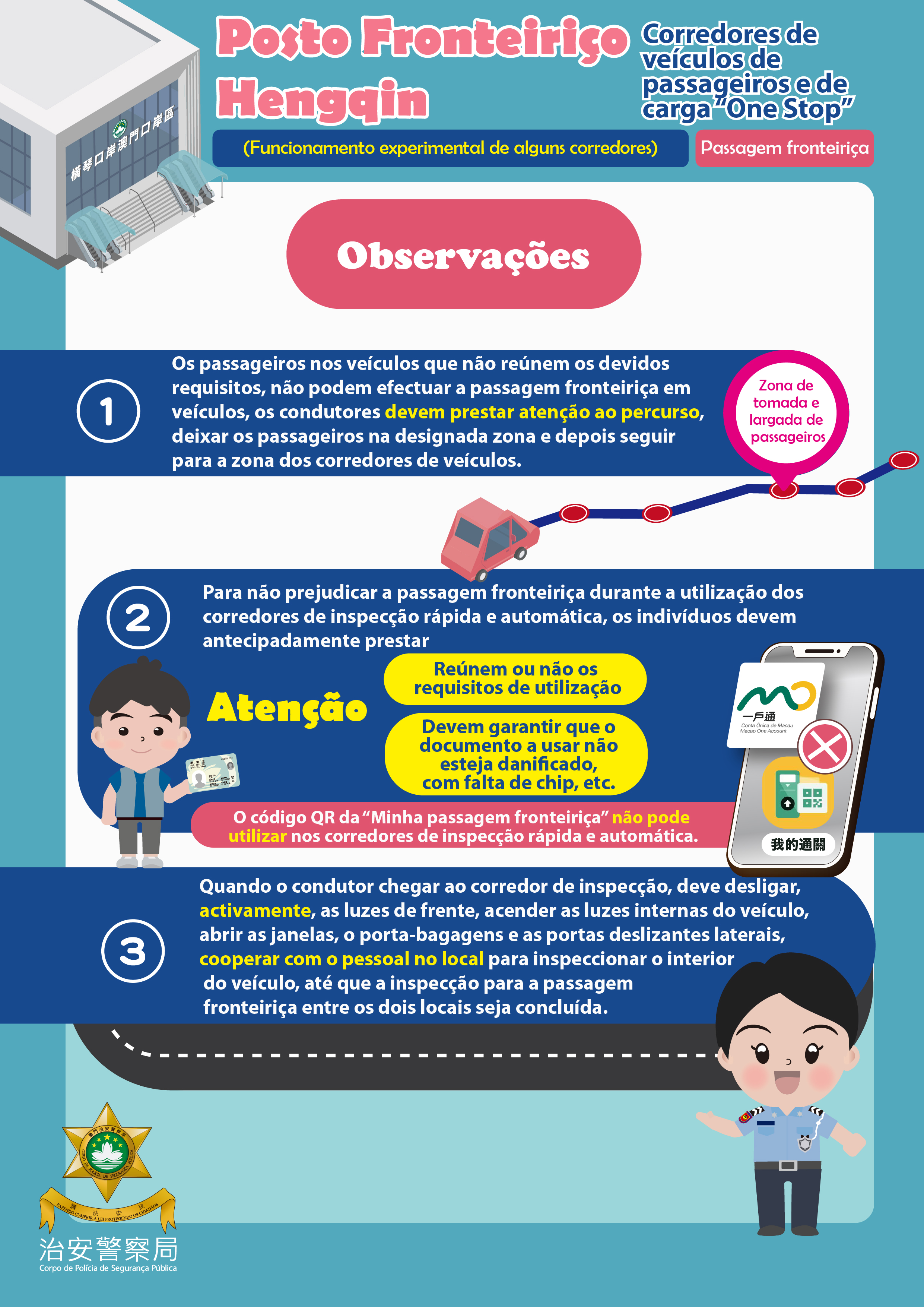 Após o funcionamento experimental de alguns corredores de veículos de inspecção conjunta (“One Stop”) do Posto Fronteiriço Hengqin, as faixas de tráfego e os modelos de inspecção serão alterados, os condutores e passageiros de veículo devem prestar atenção às seguintes observações.