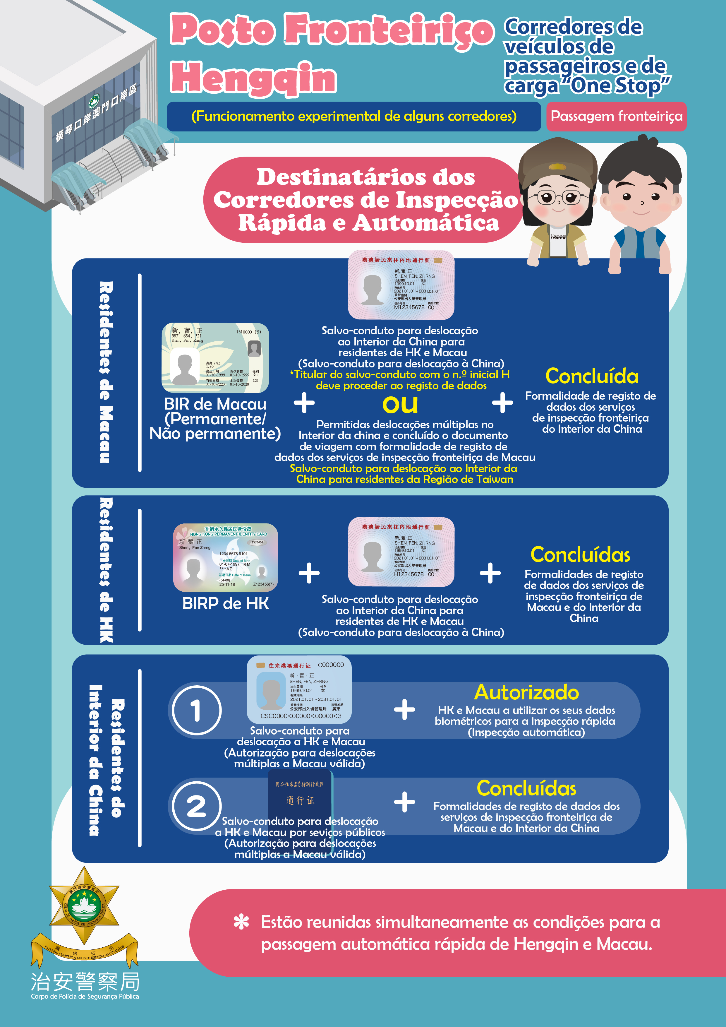 Quando utiliza os corredores de inspecção rápida e automática, os condutores efectuam a leitura do documento de identificação necessário à entrada da região destinatária no Quiosque de recolha de informações pessoais “one stop” da saída fronteiriça (ex.: os residentes de Macau utilizam o Salvo-conduto para deslocação à China para ir a Hengqin, e o BIR de Macau quando voltam para Macau). Solicita-se a atenção, o código QR da “Minha passagem fronteiria ” não pode ser utilizado nos corredores de inspecção rápida e automática.