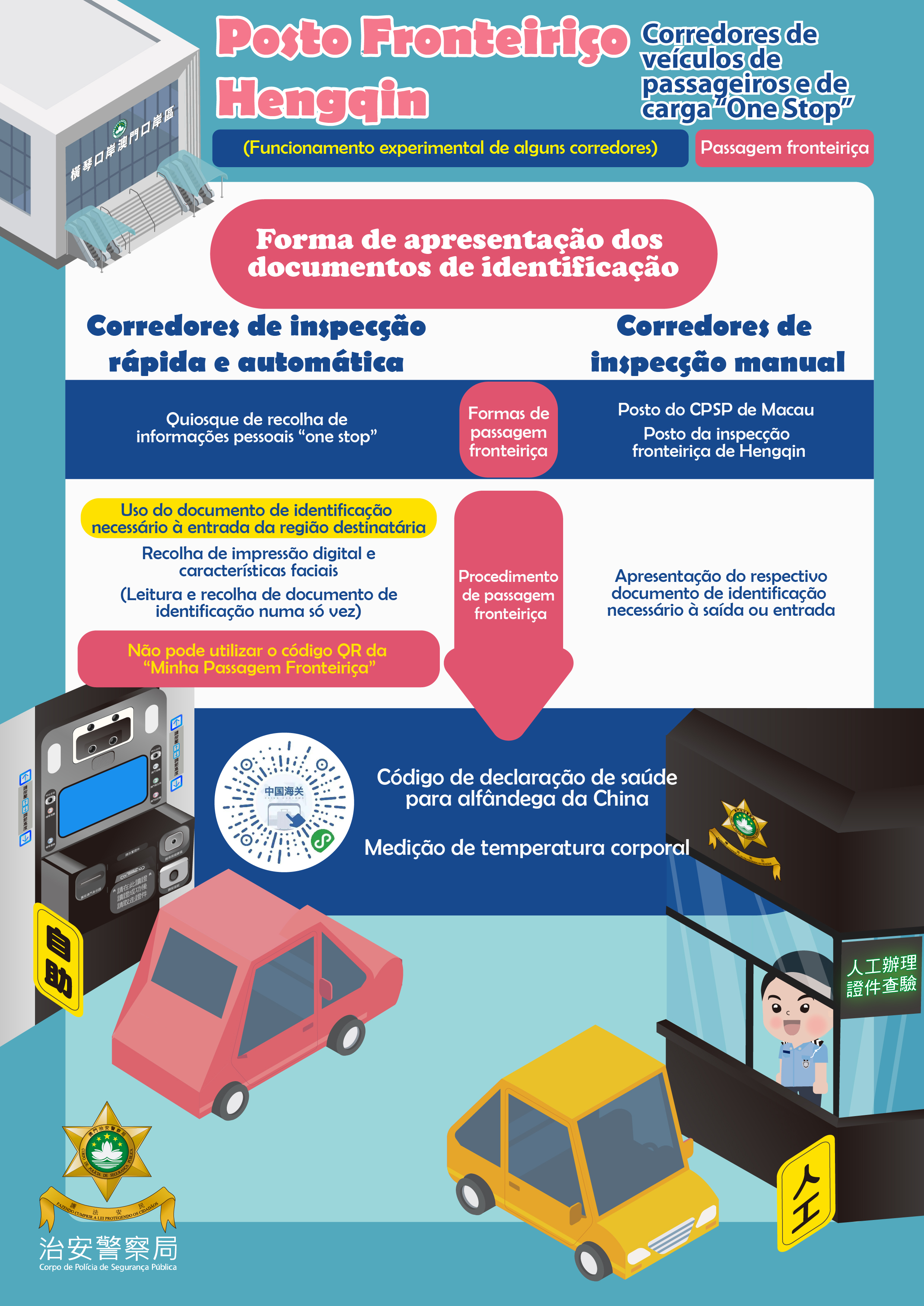 Quando utiliza os corredores de inspecção manual, o procedimento é idêntico ao adoptado nos canais de inspecção manual na Sala de Inspecção de Passageiros, os condutores e passageiros apresentam os respectivos documentos de identificação necessários à saída ou entrada nos postos de inspecção fronteiriça de Hengqin e Macau (ex.: os residentes de Macau apresentam o BIR de Macau no posto de inspecção fronteiriça de Macau, e o Salvo-conduto para deslocação à China no posto de inspecção fronteiriça de Hengqin). Concluída a inspecção dos documentos de identificação para a saída, cada um deve efectuar a leitura do código de declaração de saúde para alfândega e a medição de temperatura corporal no Quiosque de recolha de informações pessoais “one stop” da saída fronteiriça.
