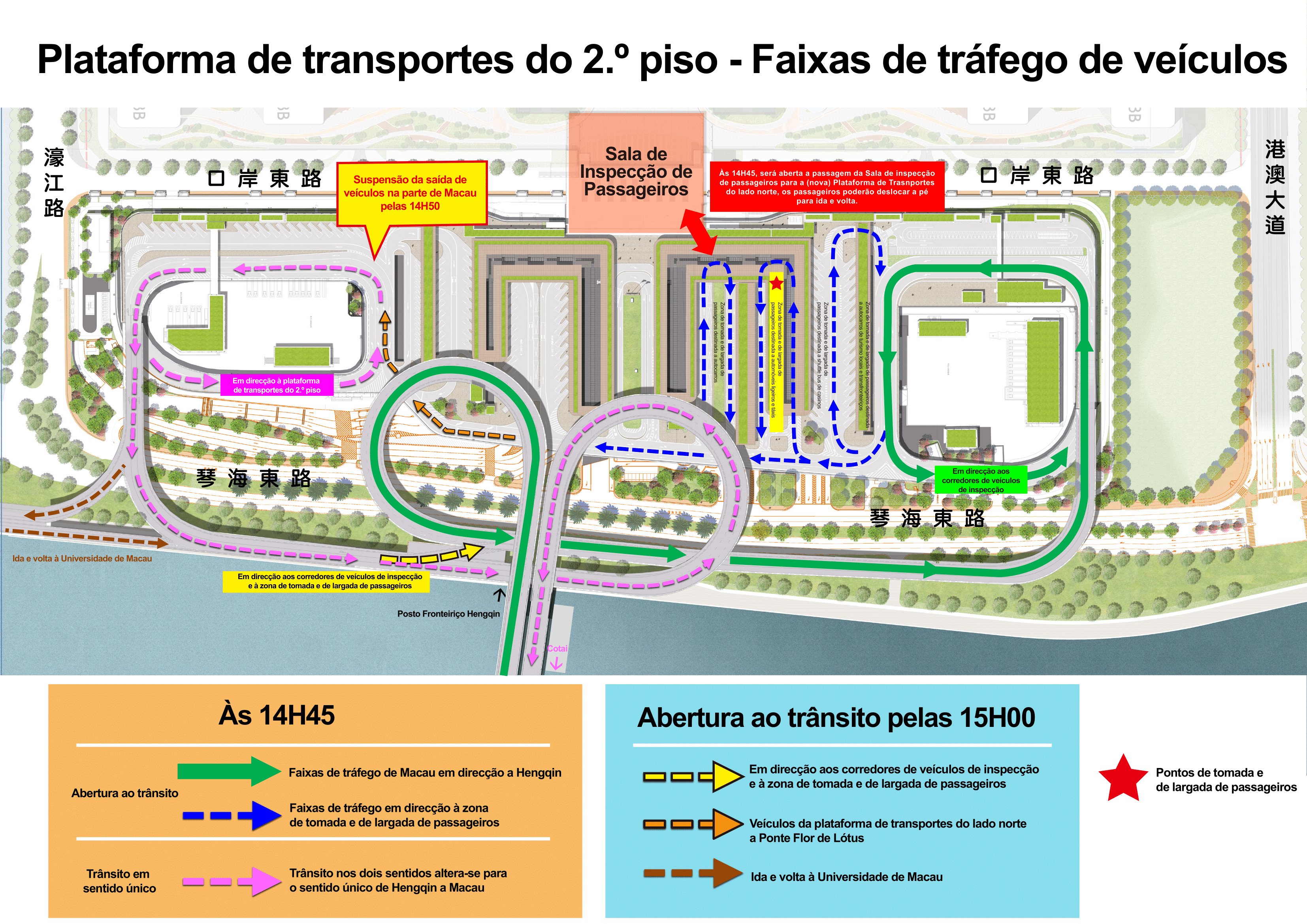 Às 14H45, será aberta a passagem da Sala de inspecção de passageiros para a (nova) plataforma de transportes do lado norte, os passageiros poderão deslocar-se a pé para ida e volta. Ao mesmo tempo, serão aberta as faixas de rodagem da Ponte Flor de Lótus para a (nova) plataforma de transportes do lado norte do 2.º piso, proibindo os veículos a circular pela (antiga) plataforma de transportes do lado sul do 2.º piso, os condutores devem colaborar com as instruções do pessoal no local para uma circulação ordenada. A Ponte Flor de Lótus será totalmente reaberta ao trânsito, ligando a zona do Cotai de Macau e a zona do Posto Fronteiriço de Macau do Posto Fronteiriço Hengqin, e sendo proibida a circulação de motociclos, bicicletas e peões.