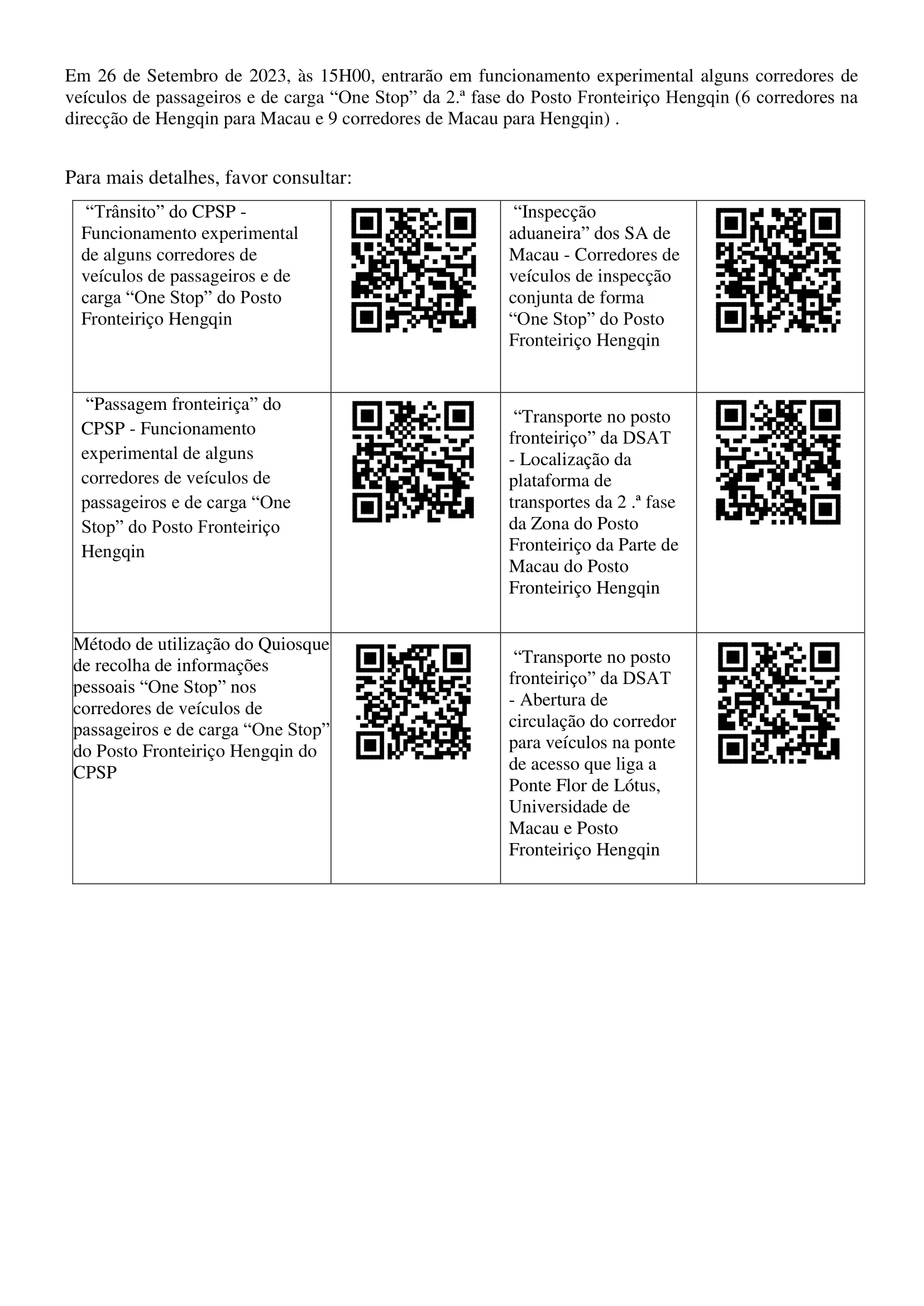 Após a abertura de alguns corredores de inspecção conjunta (“One Stop”) haverá algumas mudanças nas faixas de tráfego de veículos, pelo que o CPSP apela aos condutores que utilizam o Posto Fronteiriço Hengqin para estarem atentos, organizarem adequadamente os seus itinerários, seguirem as instruções dos agentes do local e coordenarem com a respectiva organização. A par disso, no intuito de assegurar a fluidez na passagem fronteiriça, deve se informar antecipadamente sobre a forma de utilização do quiosque de recolha de informações pessoais “One Stop” e ter o documento de identificação necessário à entrada da região destinatária, bem como a declaração de saúde feita através do “código aduaneiro” prontos para a utilização do referido quiosque. Para mais pormenores, consulte as respectivas informações (veja o link do código QR na imagem 2 do anexo).