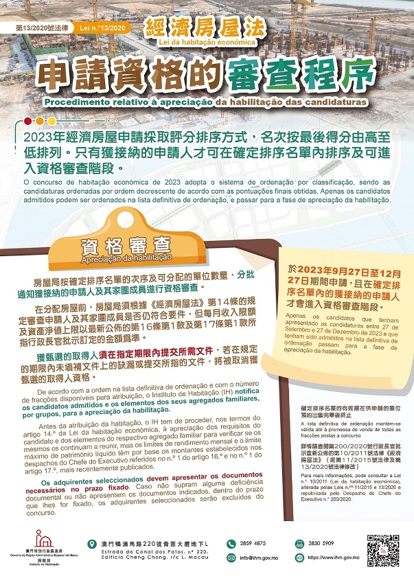 Nos termos da Lei n.º 13/2020 (Alteração à Lei n.º 10/2011 — Lei da habitação económica), as candidaturas podem ser apresentadas por candidatos com agregados familiares ou candidatos individuais, o candidato com agregado familiar deve ter completado 18 anos de idade, o candidato individual deve ter completado 23 anos de idade, devendo, ambos, ser residentes permanentes de Macau que residam há, pelo menos, 7 anos. A posição de contraente da habitação económica é assumida apenas pelo candidato, devendo este ter permanecido em Macau, pelo menos, 183 dias nos 12 meses anteriores ao fim do prazo de apresentação da candidatura (27 de Dezembro de 2023).