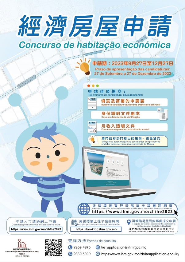 Para mais informações, os residentes podem enviar o correio electrónico (he_application@ihm.gov.mo), visitar a página electrónica (https://www.ihm.gov.mo/pt/heapplication-enquiry) ou telefonar para o número 2859 4875. Além disso, também podem efectuar a marcação prévia para visitar a exposição sobre habitação económica na Zona A dos Novos Aterros, de modo a conhecer a compartimentação e os materiais utilizados na habitação. O IH irá publicar a situação do concurso de habitação económica na página electrónica temática, enquanto o concurso estiver a decorrer.