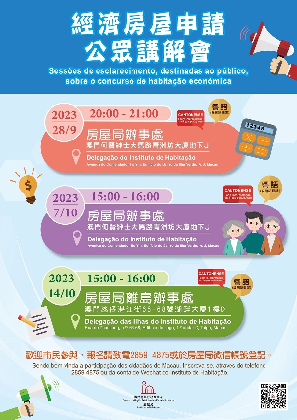 O IH irá realizar 3 sessões de esclarecimento, destinadas ao público, sobre o concurso de habitação económica (Tabela II), podendo os interessados fazer a inscrição através do telefone n.º 2859 4875 ou da conta de WeChat do IH.