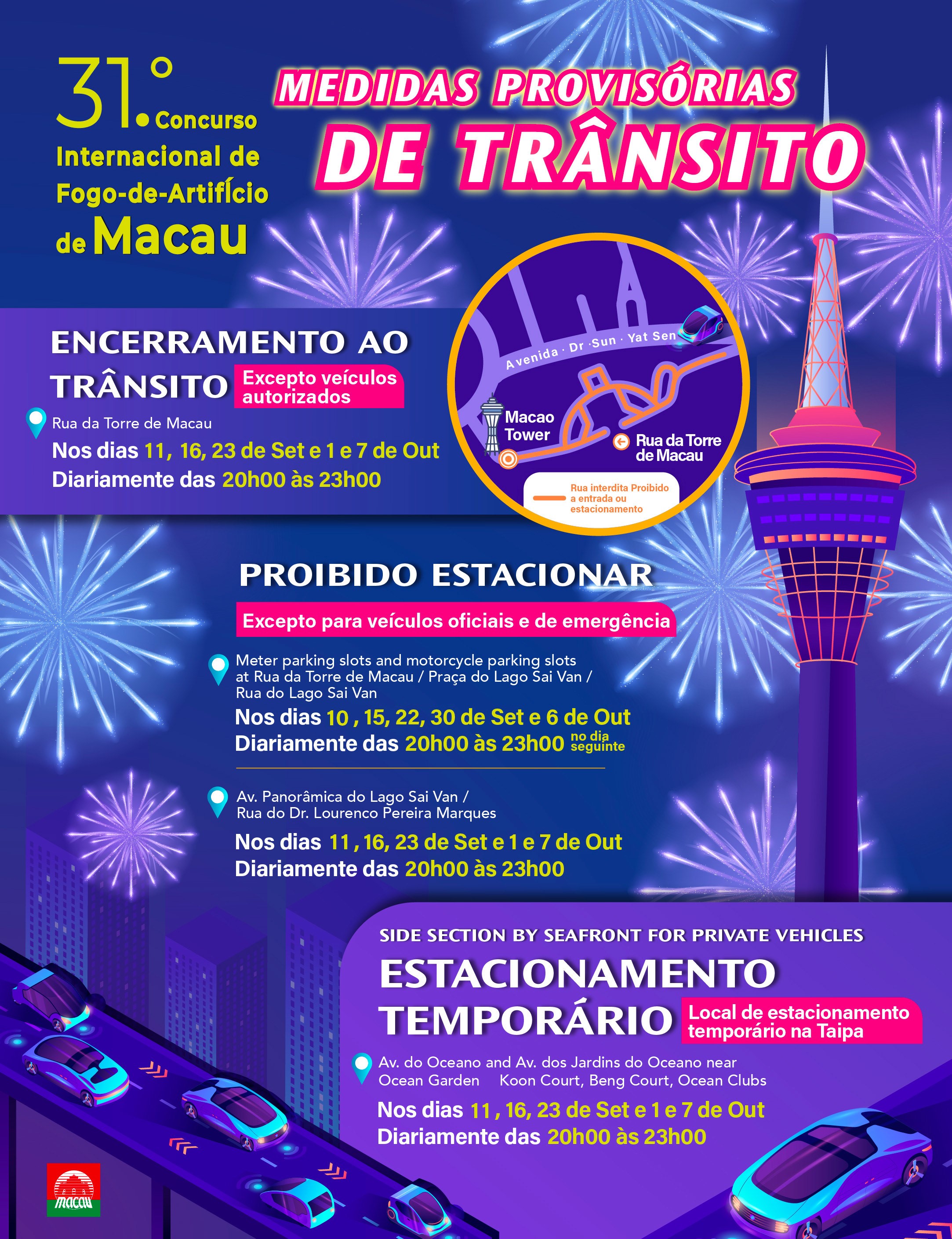 Durante o período de exibições do CIFAM serão implementadas medidas provisórias de trânsito em zonas designadas, que incluem encerramento ao trânsito, autorização temporária e interdição de estacionamento, entre outras, para o que se solicita a atenção de todos os interessados para infografias relacionadas e cumprimento das disposições no local.