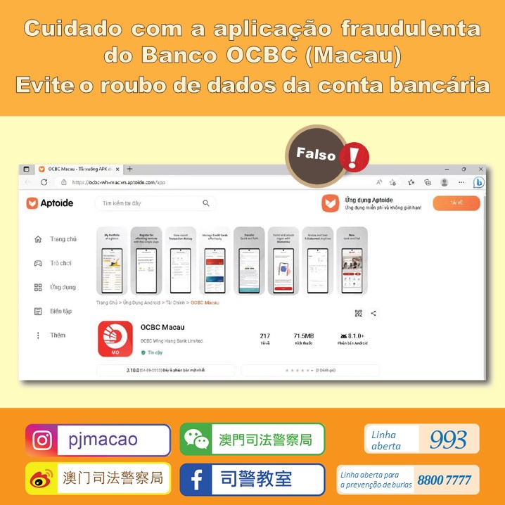 Hoje a PJ foi informada pelo Banco OCBC (Macau) que foi descoberta uma aplicaçao falsa do banco numa plataforma de download de apps de terceiros. Como o nome, o ícone e a interface desta aplicação são muito semelhantes ao do oficial, os criminosos podem aproveitam esta aplicação de phishing para roubar os dados das contas bancárias das pessoas.