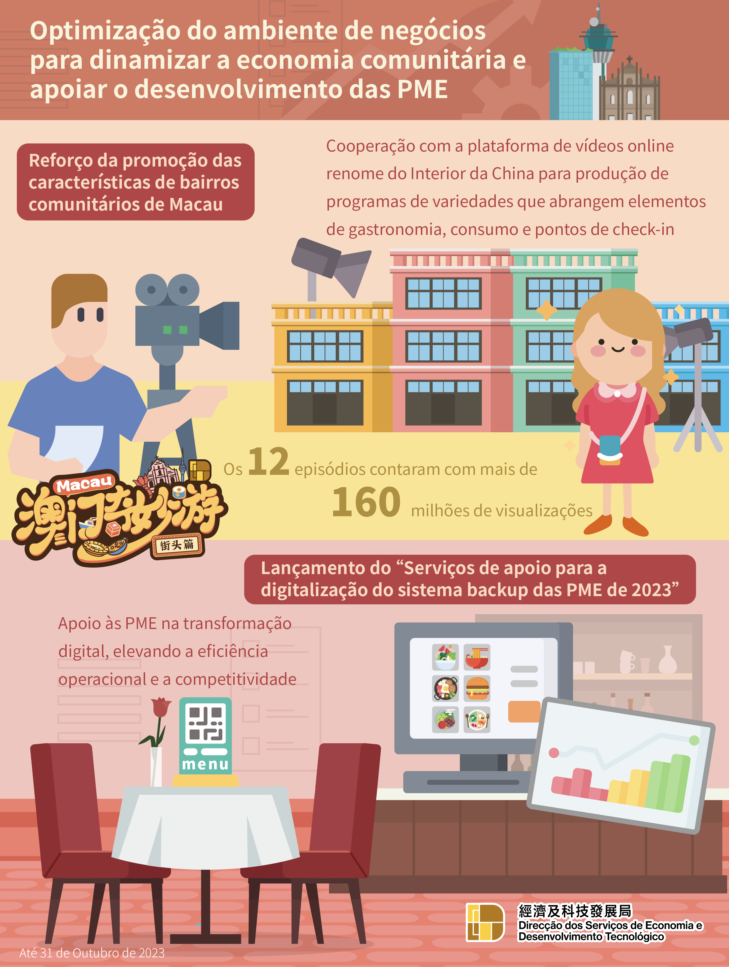Para continuar a optimizar o ambiente de negócios e revitalizar a economia comunitária, o Governo da RAEM adoptou medidas de diversas vertentes para ajudar as empresas de Macau a elevar a eficiência de gestão e a competitividade, incluindo o recurso à tecnologia inovadora para mostrar o encanto característico da comunidade e o reforço da divulgação e promoção online e offline, de modo a encaminhar pessoas a consumirem em bairros comunitários.
