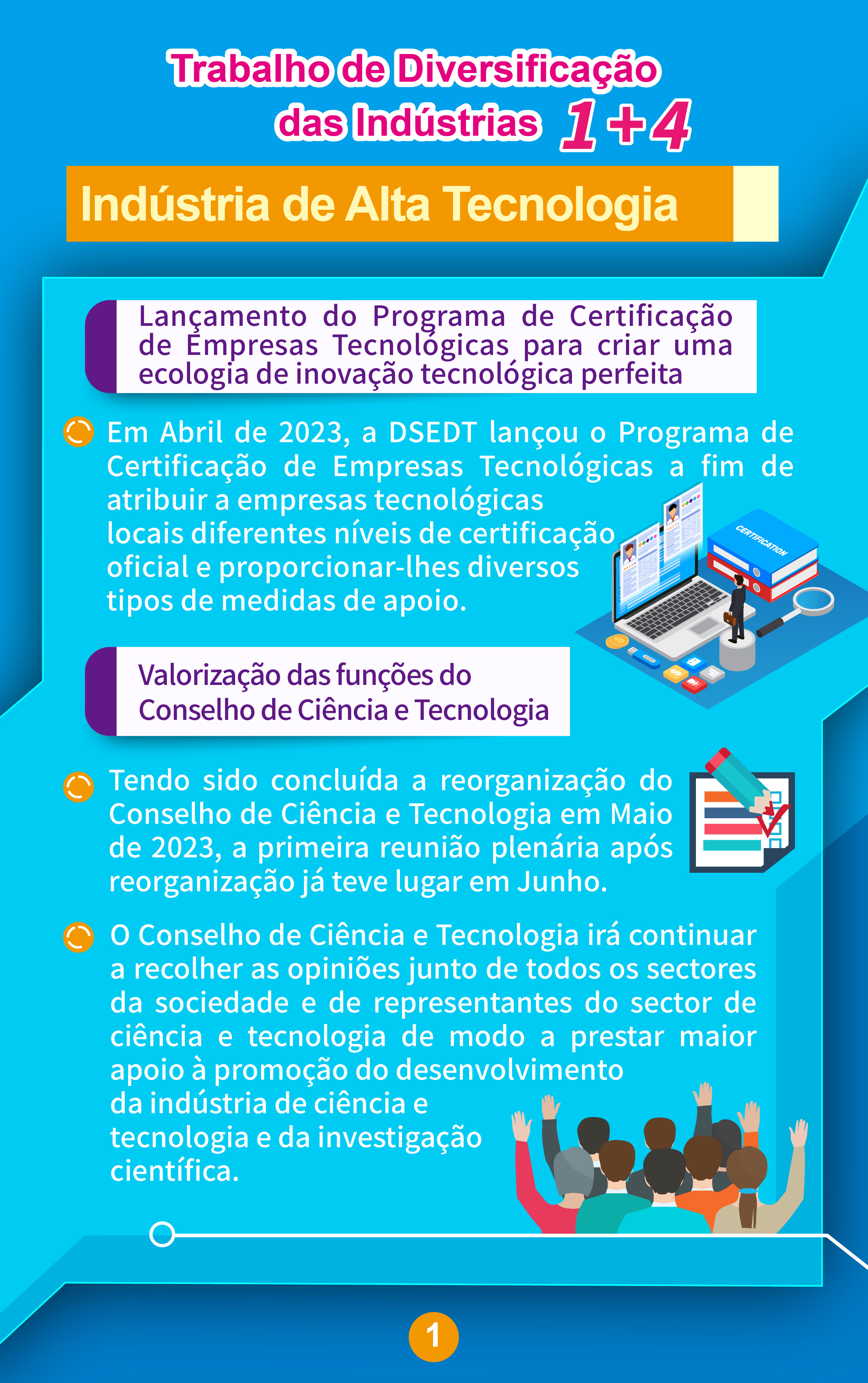 O Governo da RAEM está a impulsionar activamente a estratégia de desenvolvimento da diversificação adequada “1+4”, incluindo as altas e novas tecnologias. Nos últimos anos, o Governo da RAEM tem realizado vários trabalhos na promoção do desenvolvimento da tecnologia, incluindo a promoção da cooperação Indústria-Universidade-Pesquisa entre as empresas e das instituições de investigação científica, promovendo o intercâmbio e cooperação tecnológica com o Interior da China e os Países de Língua Portuguesa, etc. Através do lançamento de diversas políticas e actividades de apoio, o Governo da RAEM tem criado um melhor ambiente político para o desenvolvimento da indústria da tecnologia, promovendo a inovação tecnológica e o desenvolvimento das indústrias de alta e nova tecnologia.