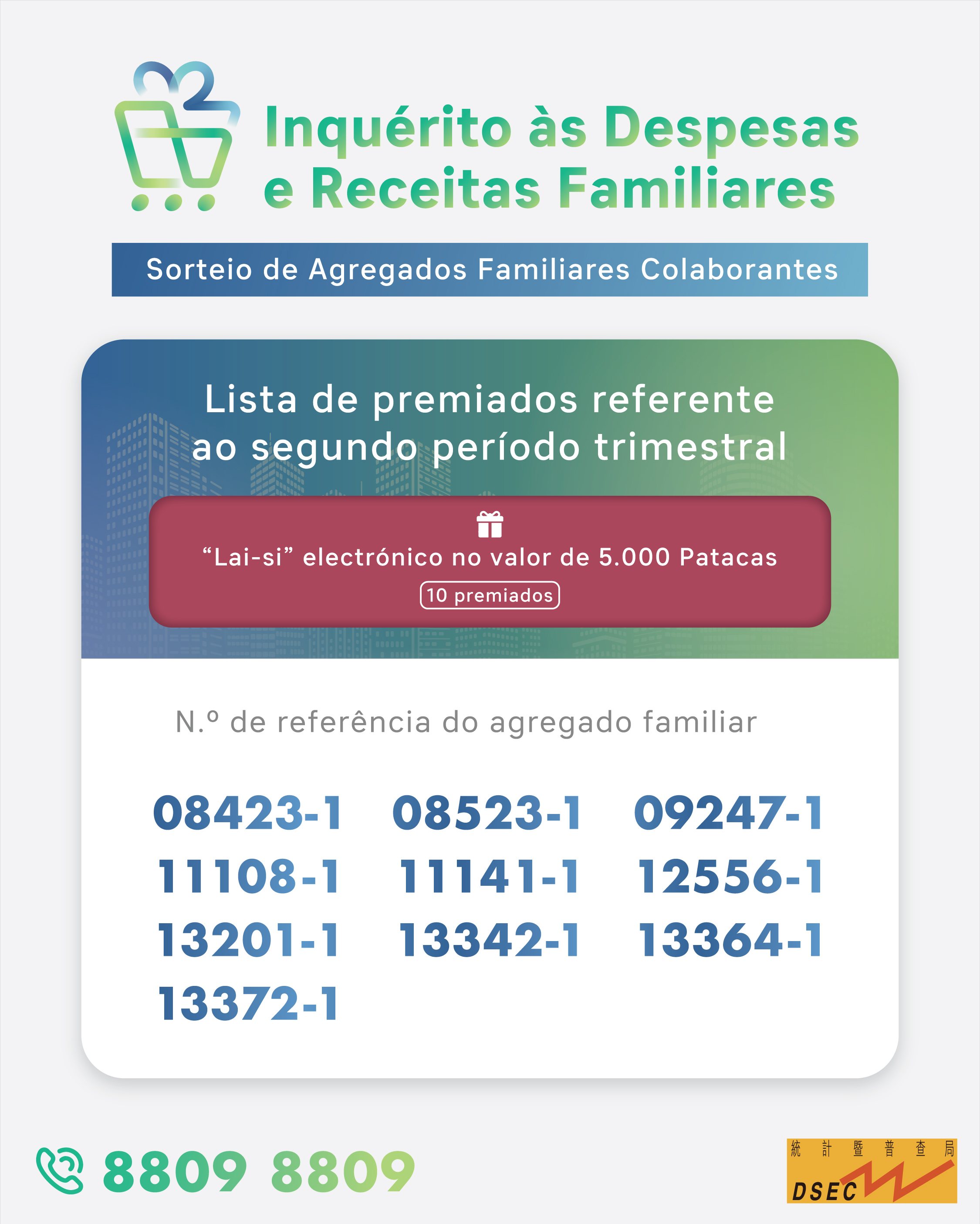 No dia 27 de Outubro de 2023 realizou-se a cerimónia do “Sorteio de Agregados Familiares Colaborantes” relativo ao segundo período trimestral, tendo sido sorteados dez agregados familiares com os números de referência seguintes: 08423-1; 08523-1; 09247-1; 11108-1; 11141-1; 12556-1; 13201-1; 13342-1; 13364-1 e 13372-1. Os agregados familiares premiados irão ser notificados por carta da DSEC.