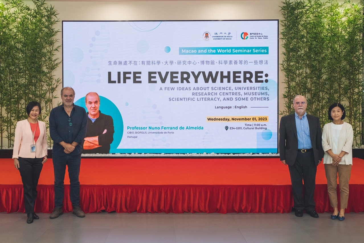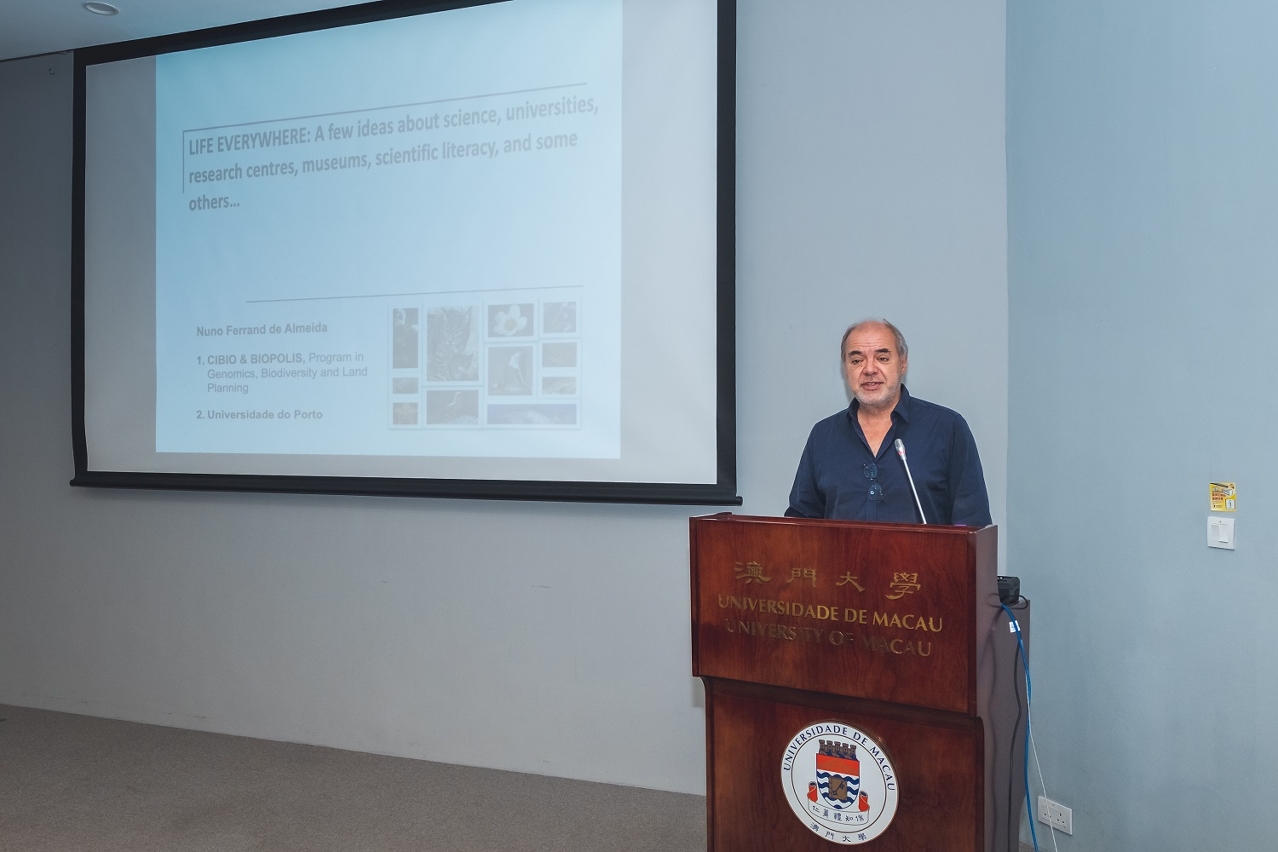 O Centro de Estudos de Macau (CMS) da Universidade de Macau (UM) realizou, no dia 1 de novembro de 2023, um seminário intitulado "A VIDA EM TODO O LADO: algumas ideias sobre ciência, universidades, centros de investigação, museus, alfabetização científica e outras", cujo orador foi o Prof. Nuno Ferrand de Almeida. O Prof. Almeida é um biólogo de renome mundial e professor de Biologia Evolutiva e da Conservação na Universidade do Porto, Portugal, e foi galardoado com a Légion d'Honneur pelo Presidente francês em 2023.
