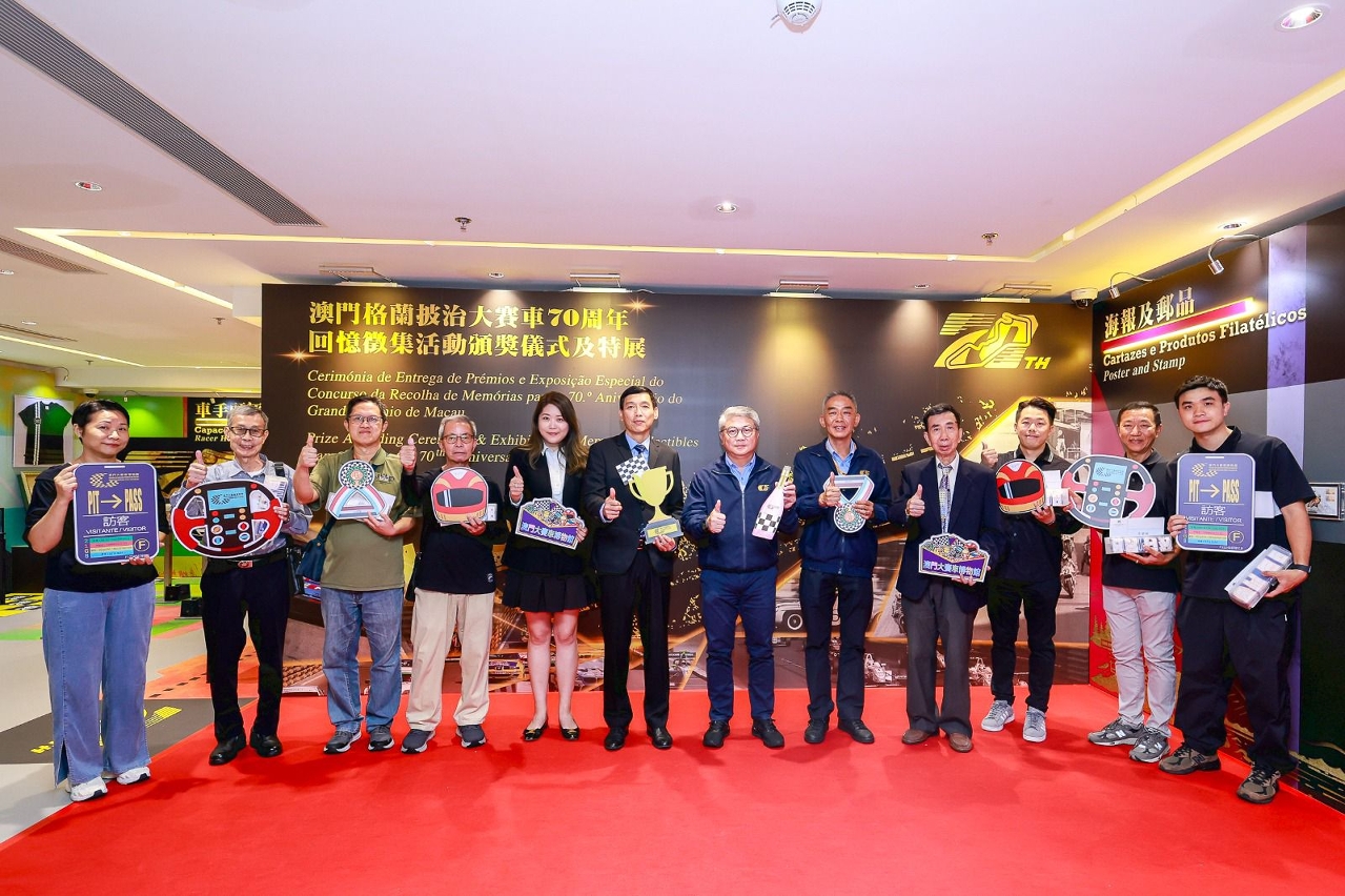 A cerimónia de entrega de prémios do “Concurso de Recolha de Memórias para o 70.º Aniversário do Grande Prémio de Macau” teve lugar hoje (dia 9) no Museu do Grande Prémio de Macau. Os artigos premiados estão também em exibição no museu a partir de hoje, até ao final de Janeiro do próximo ano. Por outro lado, foi hoje inaugurada a loja exclusiva para venda de lembranças do Museu do Grande Prémio de Macau com uma nova fisionomia. Através da realização de uma série de actividades especiais, a Direcção dos Serviços de Turismo (DST) pretende prolongar o ambiente animado do mês do Grande Prémio de Macau (GPM), para celebrar com o público a 70.a edição do evento.