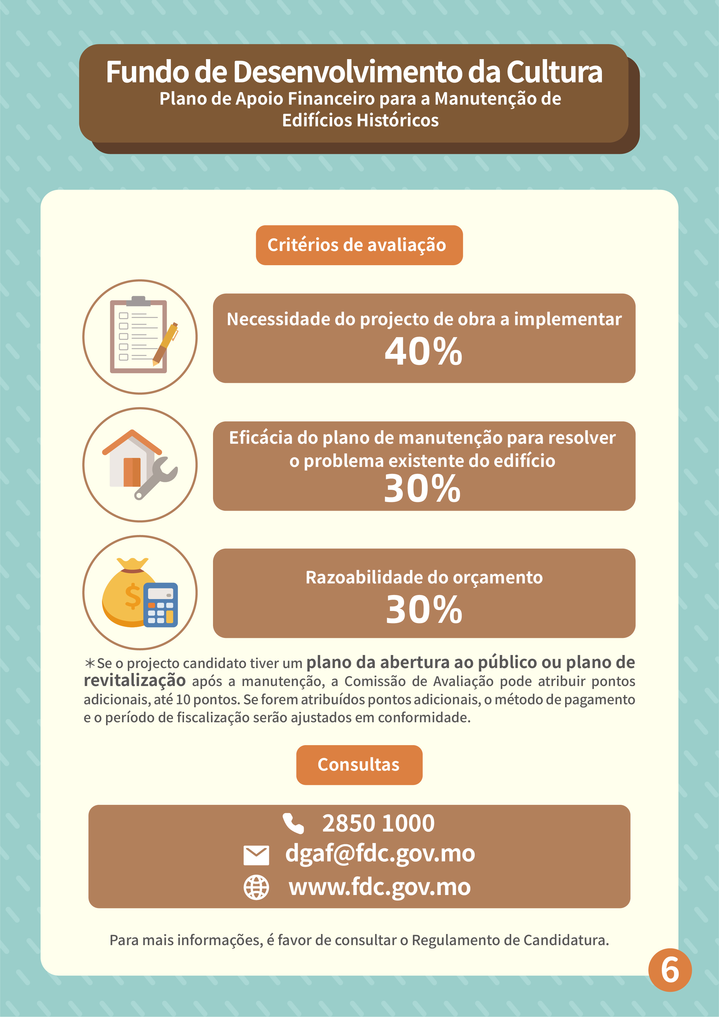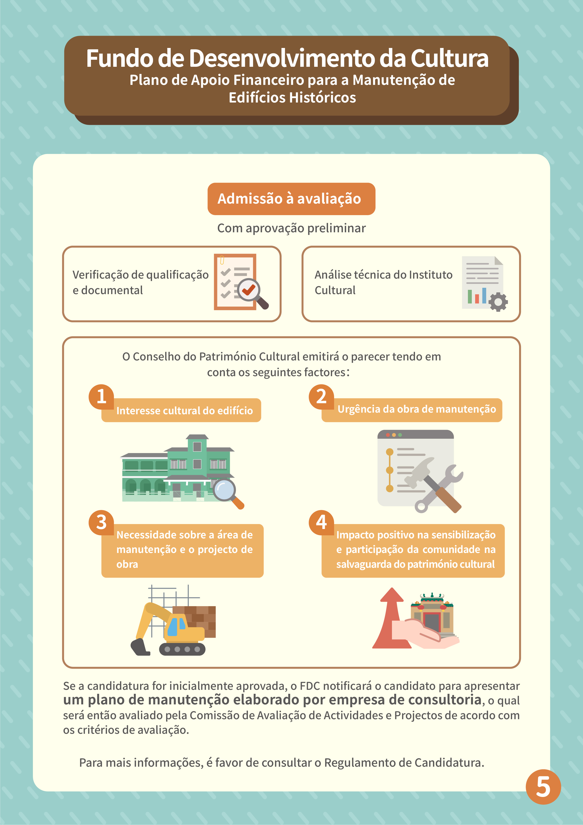 Para melhor promover a salvaguarda e a revitalização dos edifícios históricos, o Fundo de Desenvolvimento da Cultura (FDC) lança o “Plano de apoio financeiro para a manutenção de edifícios históricos”, de modo a aumentar a motivação dos proprietários de realizarem a manutenção regular por iniciativa própria e reforçar a salvaguarda dos edifícios patrimoniais privados e de interesse cultural.