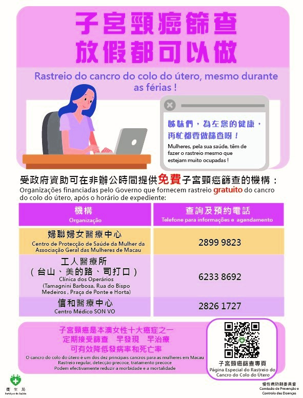 Os Serviços de Saúde afirmam que o cancro do colo do útero é o quarto cancro mais comum em mulheres em todo o mundo. Este é um tumor maligno que ocorre no colo do útero, derivado do crescimento de forma descontrolada das células. Normalmente, o corpo consegue eliminar as células anormais e o colo do útero volta ao normal. Mas, por vezes, isso não acontece e as células anormais podem evoluir para o cancro. Segundo um estudo global, o papilomavírus humano (adiante designado por HPV) é o único factor explícito que causa o cancro do colo do útero, e quase 100% do cancro do colo do útero está relacionado com a infecção contínua do vírus HPV de alto risco. Os Serviços de Saúde salientam que o cancro do colo do útero é uma doença evitável e, actualmente, as medidas mais eficazes de prevenção e controlo do cancro do colo do útero, reconhecidas pela Organização Mundial de Saúde (OMS), são a vacinação contra o cancro do colo do útero (vacina contra o HPV) e a realização periódica do exame de rastreio do cancro do colo do útero. A par disso, devem prestar atenção à adopção de estilos de vida saudável, incluindo descanso regular, exercício físico regular, alimentação saudável, evitar fumar ou deixar de fumar, evitar ter múltiplos parceiros sexuais e usar correctamente o preservativo.