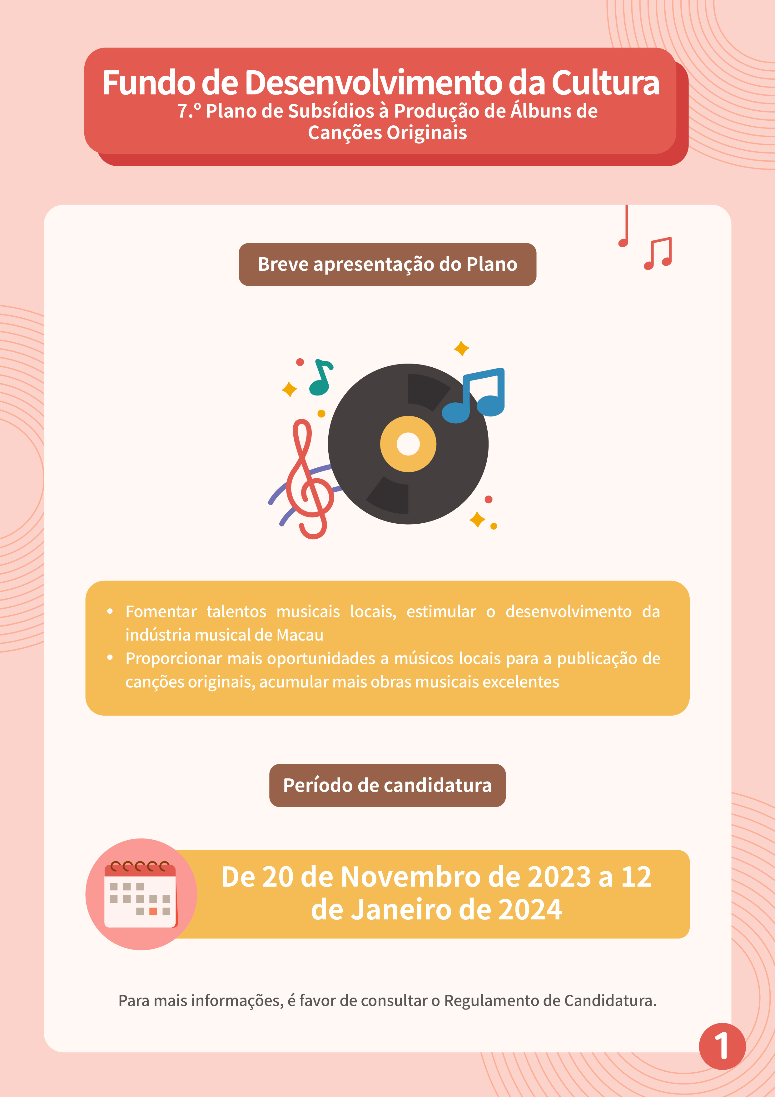 O Fundo de Desenvolvimento da Cultura (FDC) lança o “7.º Plano de Subsídios à Produção de Álbuns de Canções Originais”, com o objectivo de cultivar os talentos musicais locais, proporcionar-lhes mais oportunidades de lançar canções originais e desenvolver gradualmente o mercado, promovendo assim o desenvolvimento da indústria musical em Macau.