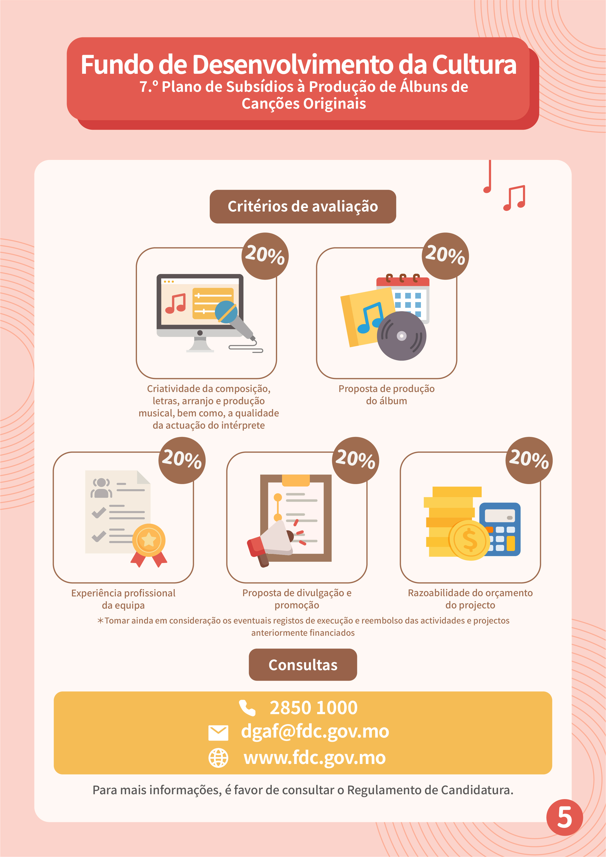 A Comissão de Avaliação de Actividades e Projectos avaliará as candidaturas de acordo com os critérios, designadamente, criatividade da composição, letras, arranjo e produção musical, bem como, a qualidade da actuação do intérprete; proposta de produção do álbum; experiência profissional da equipa; proposta de divulgação e promoção; razoabilidade do orçamento do projecto. A quota máxima para “miniálbuns” é de 6 beneficiários, com um subsídio máximo de 135 mil patacas cada; e a quota máxima para “álbuns” é de 4 beneficiários, com um subsídio máximo de 270 mil patacas cada. As despesas elegíveis incluem a produção, o transporte, a promoção, o arrendamento de estúdio de gravação e o aluguer de equipamentos, com o prazo de apoio financeiro de 18 meses. Por outro lado, o FDC organizará peritos para prestarem aconselhamento profissional aos beneficiários na produção dos seus álbuns.