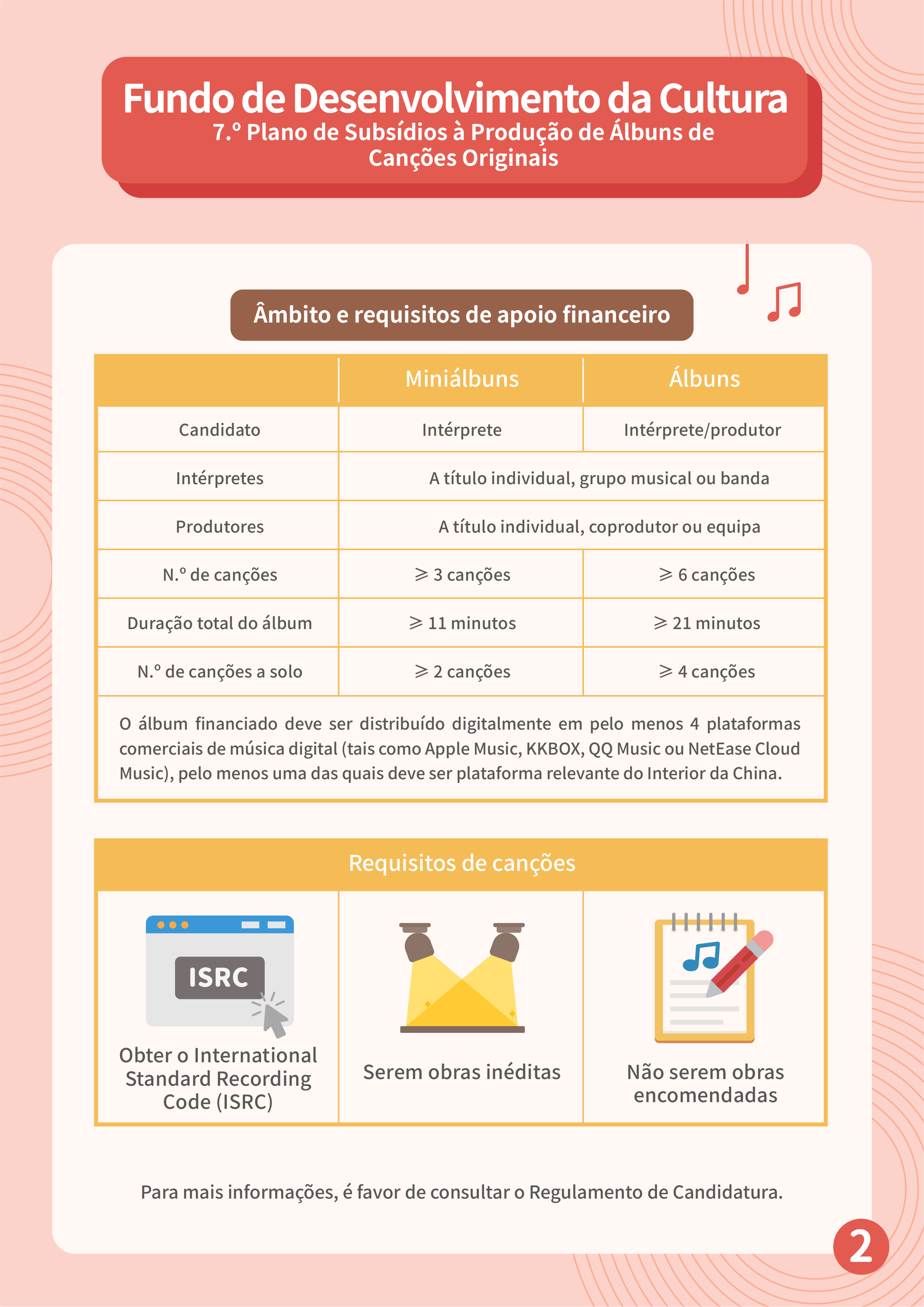 O período de candidatura decorrerá de 20 de Novembro de 2023 a 12 de Janeiro de 2024. Os álbuns a subsidiar são de dois tipos, nomeadamente, “miniálbuns” e “álbuns”, excluindo as colectâneas musicais e os álbuns de grandes êxitos. Todas as canções devem ser obras inéditas e não encomendadas, com um mínimo de 3 canções para “miniálbuns” e um mínimo de 6 canções para “álbuns”. O álbum financiado deverá ser distribuído digitalmente em pelo menos 4 plataformas comerciais de música digital, pelo menos uma das quais deve ser plataforma relevante do Interior da China.
