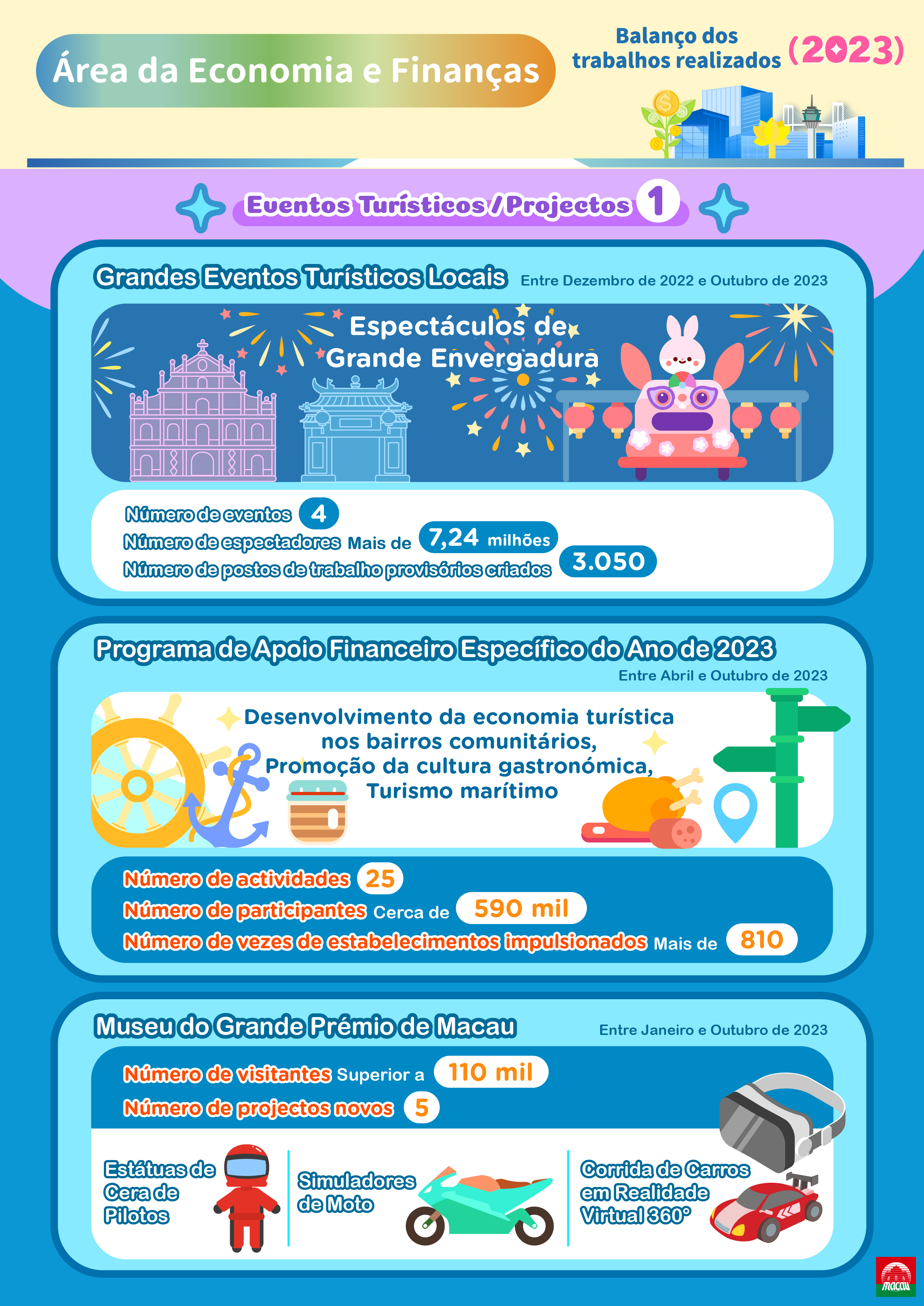 Entre Dezembro do ano passado e Outubro deste ano, a DST organizou quatro grandes eventos emblemáticos de grande escala nocturnos, que atraíram mais de 7,24 milhões de participantes. Através do seu plano específico de apoio financeiro, a DST incentivou ainda as associações a aproveitar os recursos turísticos característicos de cada zona para a realização de actividades turísticas diversificadas. O Museu do Grande Prémio de Macau recebeu até Outubro deste ano mais de 110 mil visitantes. A Expo Internacional de Turismo (Indústria) de Macau deste ano atraiu 37 mil visitantes, tendo sido realizadas mais de 8.300 sessões de bolsas de contacto online e presenciais, contribuindo para a assinatura de 44 protocolos.