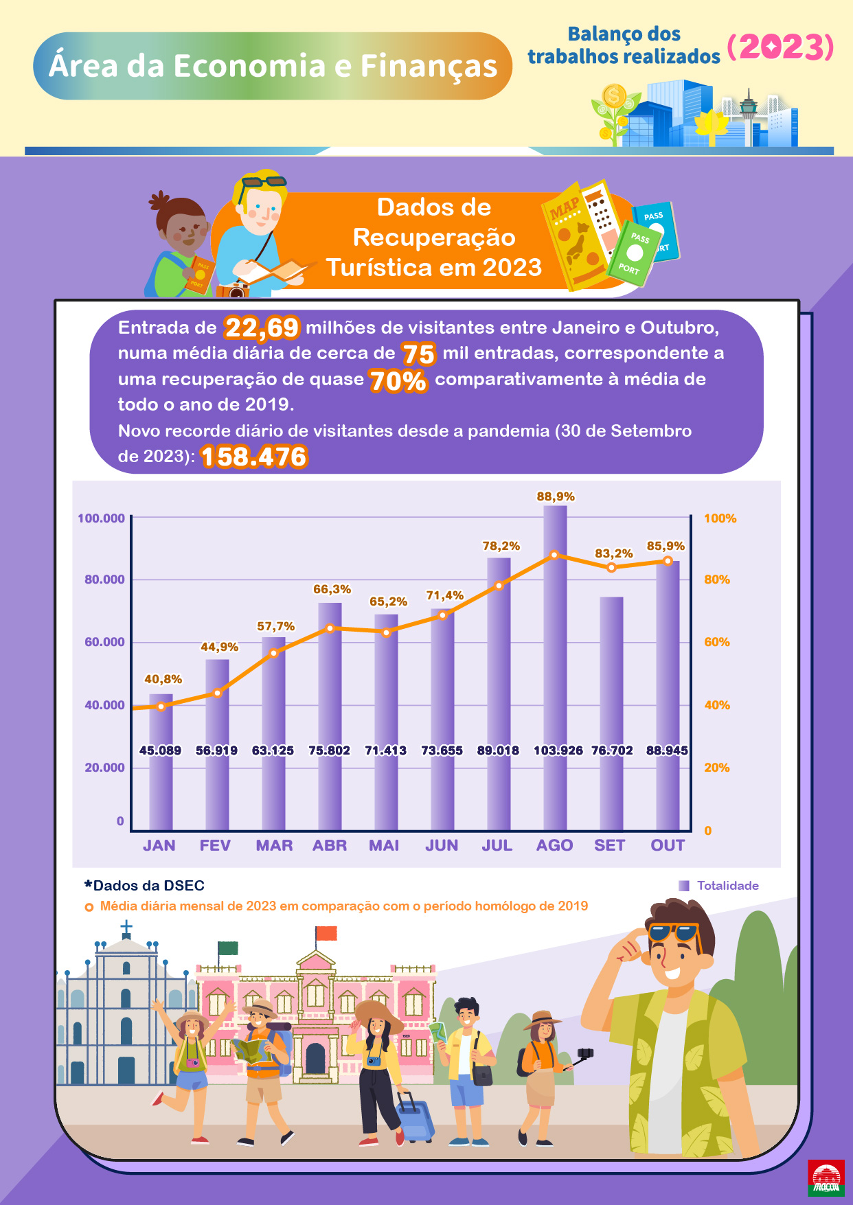 Com a abertura total das fronteiras este ano, a DST tem vindo a promover activamente o turismo de Macau no dentro do país e no exterior. O número de visitantes tem vindo a aumentar de forma estável e a recuperação do turismo e da economia tem sido positiva. De acordo com os dados da Direcção dos Serviços de Estatística e Censos, entre Janeiro e Outubro deste ano, Macau recebeu um total de 22,69 milhões de visitantes, equivalente a uma média de cerca de 75 mil por dia, número que representa uma recuperação de perto de 70% em relação à média diária de todo o ano de 2019. O número de visitantes internacionais nos primeiros dez meses do ano foi de cerca de 1,02 milhões, tendo a média diária de visitantes aumentado de cerca de mil em Janeiro para mais de 5,2 mil em Outubro, um aumento significativo de mais de cinco vezes. Em comparação com o período homólogo de 2019, a taxa média mensal de recuperação dos visitantes internacionais aumentou de 10,1% em Janeiro para 75,3% em Outubro.