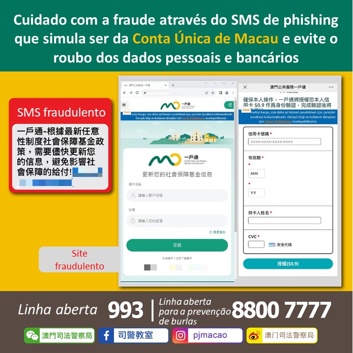 Polícia Judiciária recebeu hoje uma queixa apresentada pelo Fundo de Segurança Social de Macau, relacionada com o SMS de phishing que simula ser do FSS, onde se pede a actualização dos dados pessoais através do clique num link dizendo que, se tal não for feito, o pagamento poderá ser afectado.