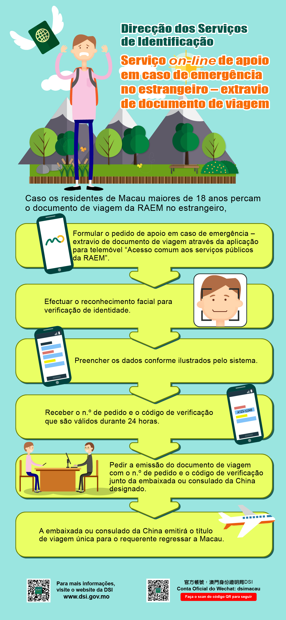 Para mais detalhes sobre o “serviço on-line de apoio em caso de emergência no estrangeiro – extravio de documento de viagem”, queira consultar www.dsi.gov.mo/ooas_p.jsp.
