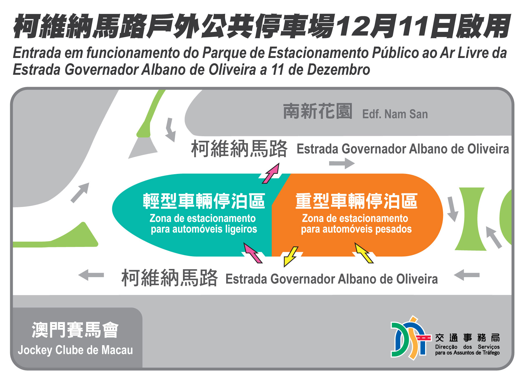 O Parque de Estacionamento Público ao Ar Livre da Estrada Governador Albano de Oliveira, situado na faixa separadora central da Estrada Governador Albano de Oliveira entre a Avenida de Kwong Tung e a Rua de Chaves, é o primeiro parque de estacionamento público ao ar livre replaneado e aberto ao público desde a entrada em vigor do Regime do Serviço Público de Estacionamento no dia 1 de Agosto do corrente ano. O parque de estacionamento disponibiliza, por enquanto, três formas de cobrança de tarifas, nomeadamente, Macau Pass, MPay e sistema de pagamento electrónico por Quick Pass da UnionPay. Na entrada do parque de estacionamento dispõe de painel informativo dos lugares, sendo as informações dos lugares também actualizadas na “Informação em tempo real sobre os parques de estacionamento públicos” da página electrónica da DSAT e da aplicação móvel “Posto de Informação de Tráfego”.