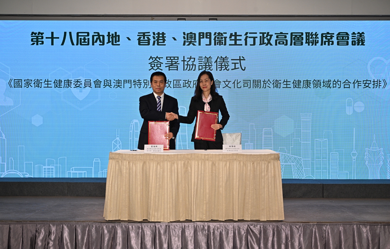 A par disso, a Secretária para os Assuntos Sociais e Cultura, Dr.a Elsie Ao Ieong U, e o Subdirector da Comissão Nacional de Saúde, Dr. Lei Haichao, renovaram os “Procedimentos de cooperação na área de saúde entre a Comissão Nacional de Saúde e a Secretaria para os Assuntos Sociais e Cultura do Governo da Região Administrativa Especial de Macau”, com vista a reforçar a cooperação na área da saúde entre o Interior da China e Macau.