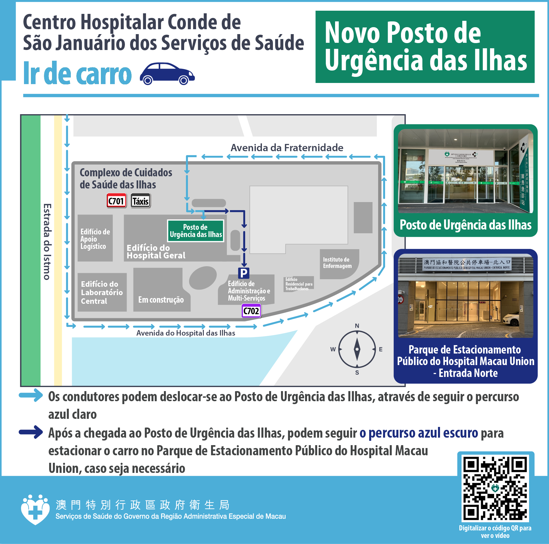O Posto de Urgência das Ilhas do Centro Hospitalar Conde de São Januário(CHCSJ), instalado no Hospital da Universidade de Ciência e Tecnologia de Macau (localizado na Avenida Wai Long, Taipa) pelos Serviços de Saúde, passará a funcionar no rés-do-chão do Edifício do Hospital Geral do Complexo de Cuidados de Saúde das Ilhas – Centro Médico de Macau do Peking Union Medical College Hospital a partir de amanhã (dia 21), entrando em funcionamento a partir das 10h00 de amanhã.