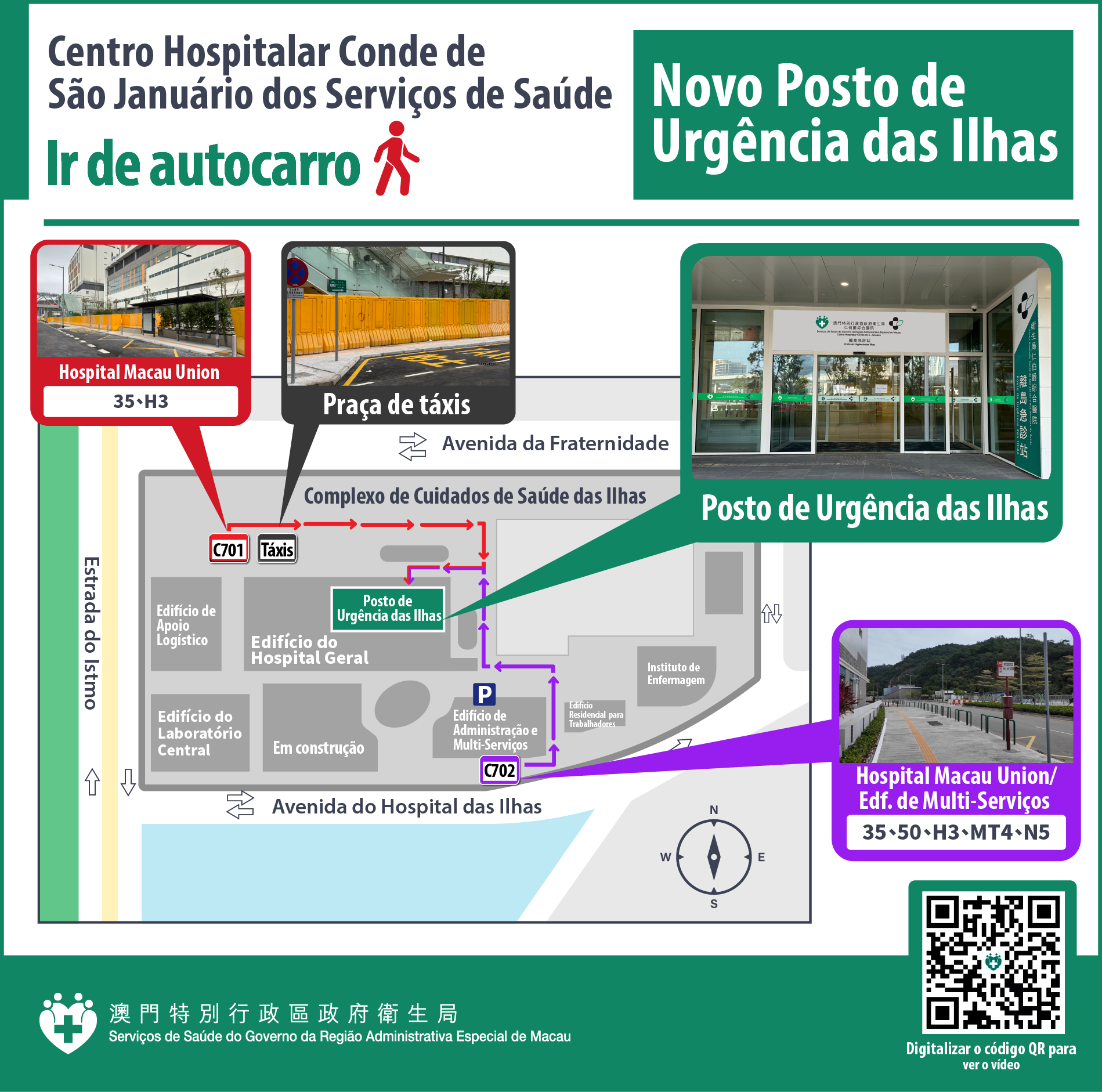 O Posto de Urgência das Ilhas do Centro Hospitalar Conde de São Januário (CHCSJ), instalado no Hospital da Universidade de Ciência e Tecnologia de Macau (localizado na Avenida Wai Long, Taipa) pelos Serviços de Saúde, passa a funcionar no rés-do-chão do Edifício do Hospital Geral do Complexo de Cuidados de Saúde das Ilhas - Centro Médico de Macau do Peking Union Medical College Hospital, a partir das 10h00 do dia 21 de Dezembro. Até às 17h00, registaram-se 77 utentes, que o funcionamento correu bem no primeiro dia.