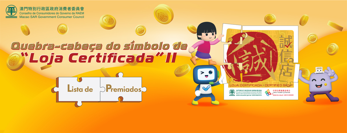 Recentemente, o CC sorteou por meio informático 40 premiados para a 2.ª fase do “Quebra-cabeça do símbolo de Loja Certificada”, que serão informados pelo CC através de SMS para levantar o prémio. A lista de premiados já encontra divulgada na página electrónica do CC (https://www.consumer.gov.mo) e afixada no quadro de aviso instalado no R/C do escritório do CC.