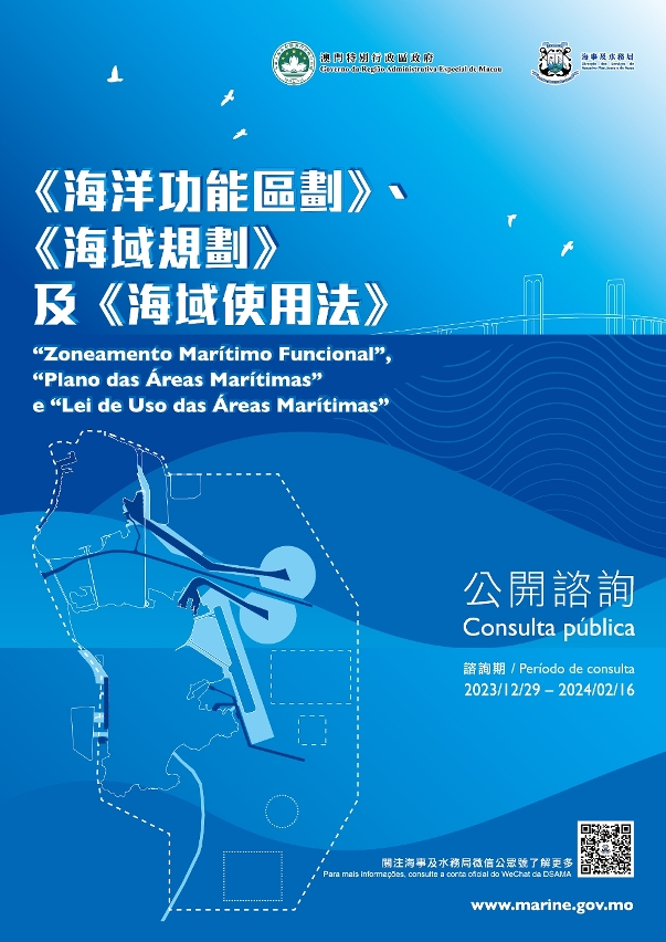 De acordo com o Decreto n.º 665 do Conselho de Estado da República Popular da China, o Governo Central delimitou as áreas marítimas sob jurisdição da RAEM em 85 quilómetros quadrados. Para melhor gerir, aproveitar e proteger as áreas marítimas de Macau, o Governo da RAEM apresentou as ideias preliminares sobre o “Zoneamento Marítimo Funcional”, o “Plano das Áreas Marítimas” e a “Lei de Uso das Áreas Marítimas” no enquadramento da “Lei de Bases de Gestão das Áreas Marítimas”, em articulação com a estratégia de desenvolvimento nacional e o planeamento do desenvolvimento marítimo nacional. No futuro, o “Zoneamento Marítimo Funcional”, o “Plano das Áreas Marítimas” e a “Lei de Uso das Áreas Marítimas” serão os fundamentos importantes para o Governo da RAEM regular a gestão das áreas marítimas.