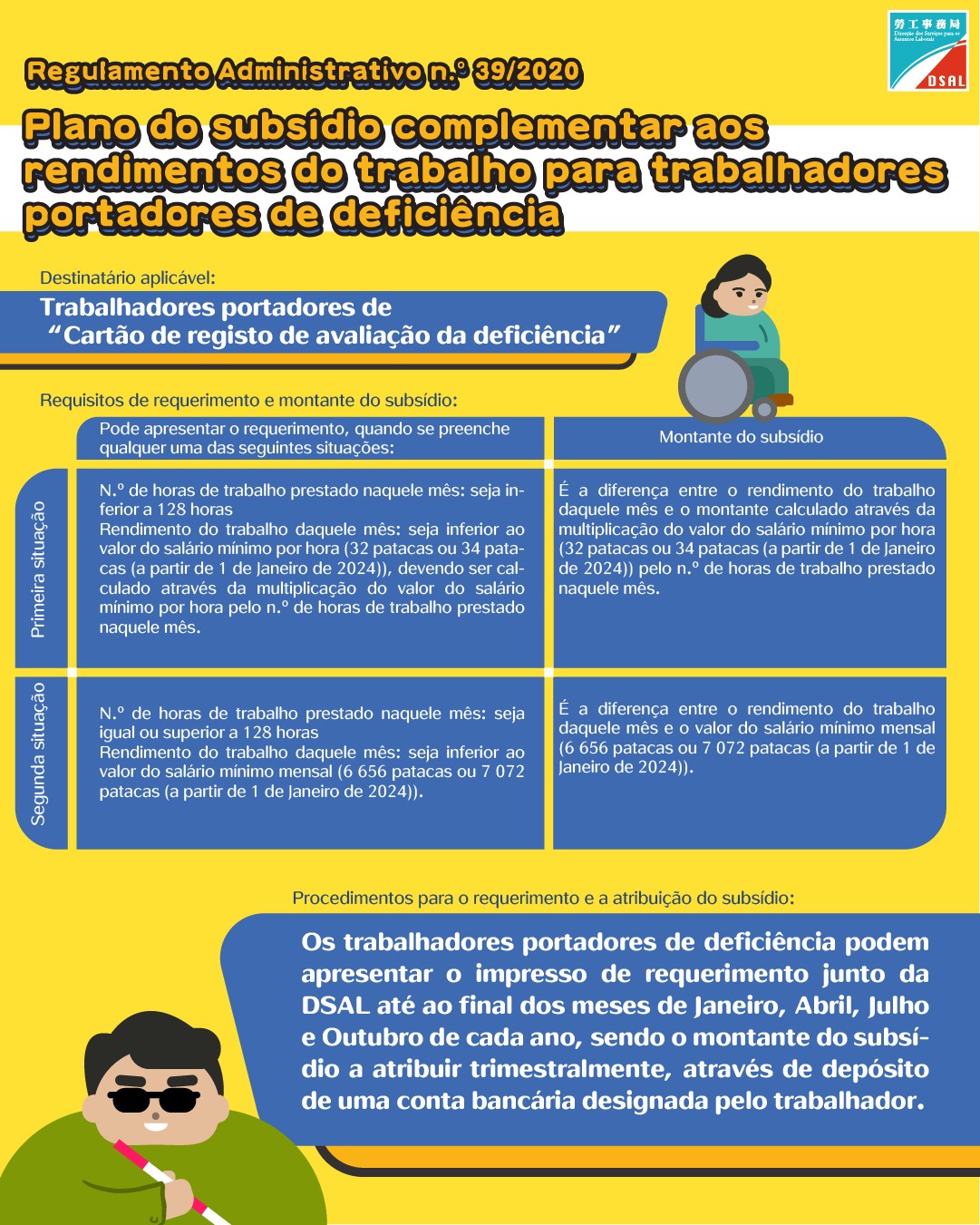 Com o intuito de apoiar o emprego das pessoas portadoras de deficiência e permitir que os trabalhadores portadores de deficiência usufruam dos direitos salariais fundamentais, o Governo da Região Administrativa Especial de Macau promulgou, em 1 de Novembro de 2020, o regulamento administrativo intitulado “Plano do subsídio complementar aos rendimentos do trabalho para trabalhadores portadores de deficiência”. De acordo com o regulamentado, podem ser apresentados nos meses de Janeiro, Abril, Julho e Outubro de cada ano os pedidos de subsídio complementar respeitante aos rendimentos do trimestre anterior, e neste seguimento, a partir de 2 de Janeiro e até 31 de Janeiro, os trabalhadores portadores de deficiência que reúnam os requisitos podem requerer junto da Direcção dos Serviços para os Assuntos Laborais (DSAL) o aludido subsídio respeitante ao quarto trimestre de 2023.