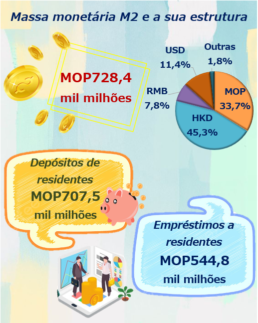 Quando comparado com o mês anterior, a circulação monetária decresceu 0,3%, mas os depósitos à ordem cresceram 2,7%. M1, assim, cresceu 1,8%, relativamente ao mês anterior. Por outro lado, as responsabilidades quase monetárias decresceram 0,2%. A soma destes dois elementos, ou seja, M2, manteve-se inalterado relativamente ao mês anterior, tendo atingido MOP728,4 mil milhões. Quando comparado com o período homólogo de 2022, M1 e M2 cresceram 4,2% e 6,7%, respectivamente. A proporção da pataca (MOP), dos dólares de Hong Kong (HKD), dos renminbi (RMB) e dos dólares dos Estados Unidos (USD) registou os “pesos” de 33,7%, 45,3%, 7,8% e 11,4%, respectivamente, em M2.