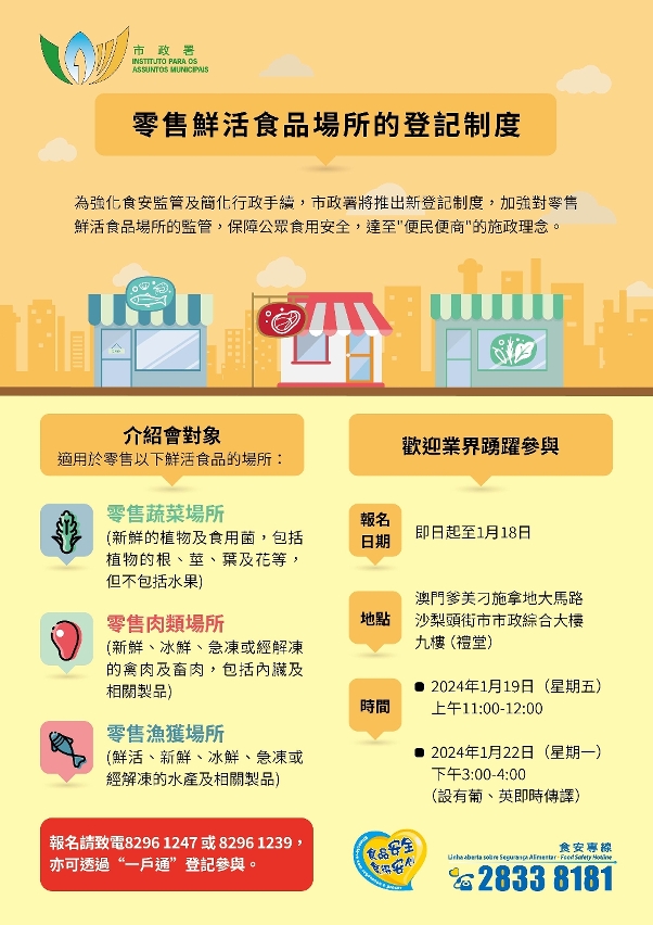O Regulamento Administrativo-Regime de registo de estabelecimentos de venda a retalho de géneros alimentícios frescos e vivos irá entrar em vigor no dia 1 de Fevereiro de 2024. Para reforçar os conhecimentos do sector alimentar sobre o regime de registo, o Instituto para os Assuntos Municipais (IAM) irá realizar duas sessões de apresentação do regime de registo nos dias 19 e 22 de Janeiro, sendo bem-vinda a participação do respectivo sector.