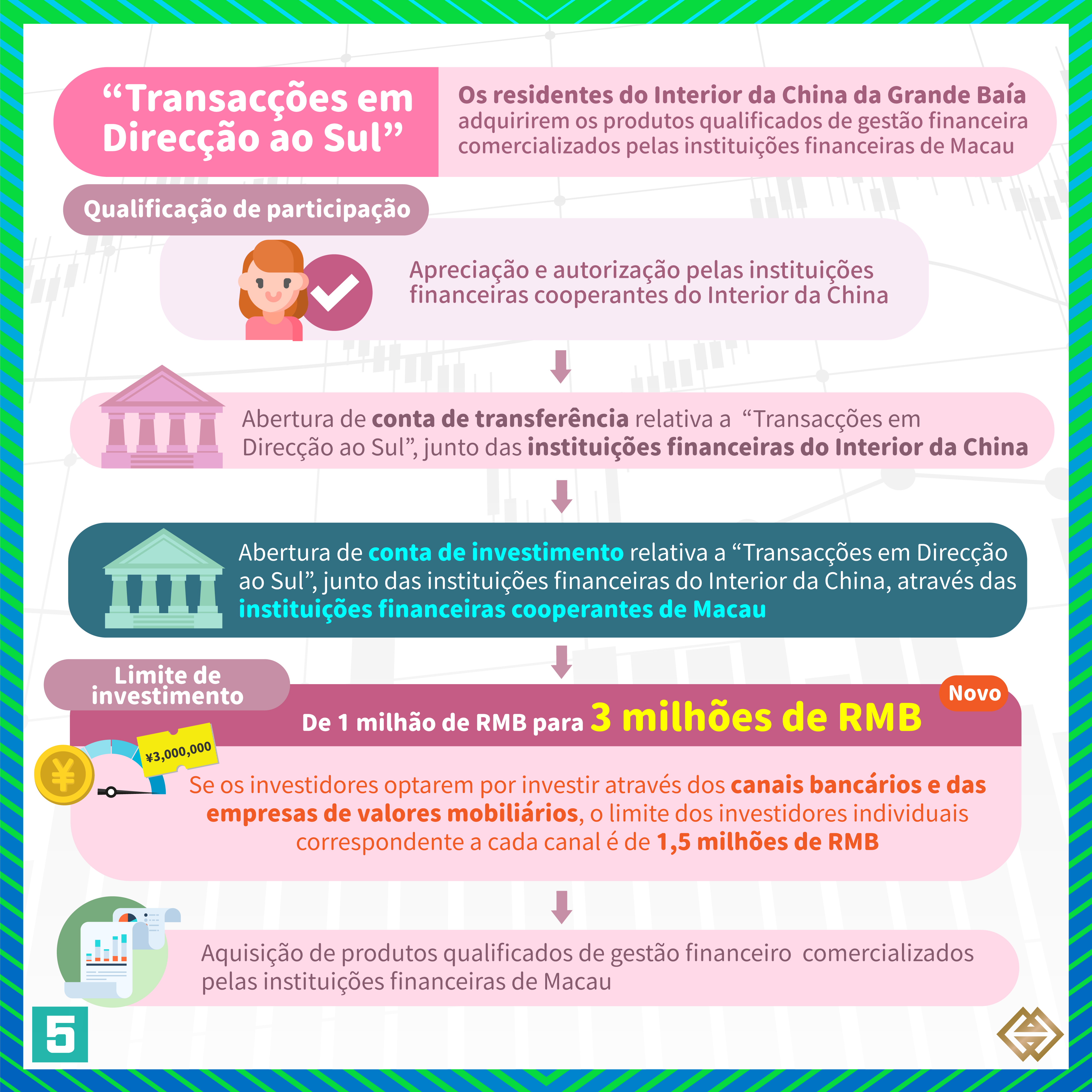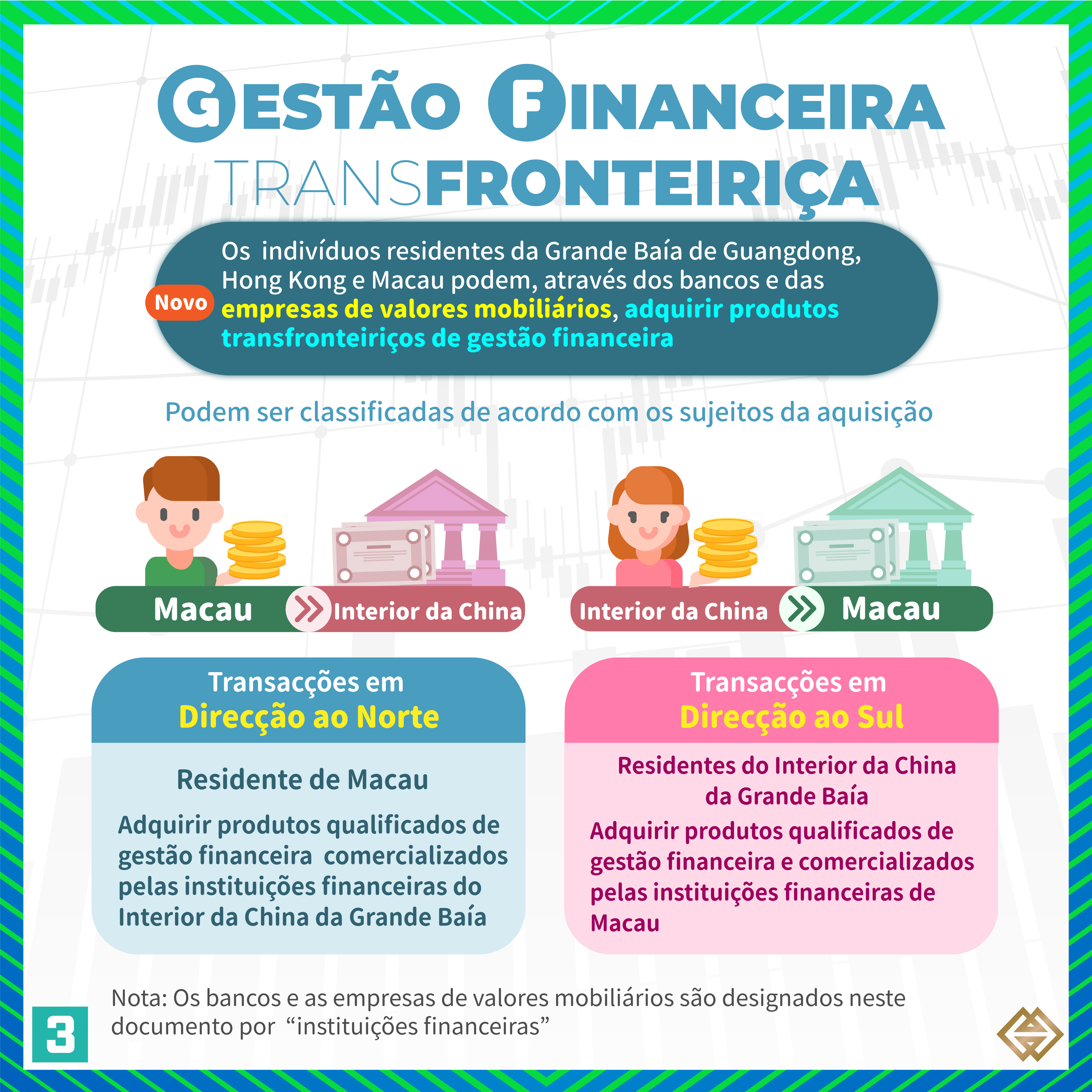 De acordo com a nova Regulamentação publicada pela AMCM, para além dos bancos de Macau autorizados a exercer a actividade de “Gestão Financeira Transfronteiriça”, as instituições financeiras licenciadas em Macau para prestar serviços relacionados com valores mobiliários (“empresas de valores mobiliários”) podem também exercer actividades de “Gestão Financeira Transfronteiriça”, em conformidade com as disposições da Regulamentação (para mais informações, consultar a lista de instituições participantes em https://www.amcm.gov.mo/zh-hant/news-notice/cross-border-financial-management/cross-border-financial-management-participating-agencies). Além disso, os investidores podem adquirir uma gama mais alargada de produtos qualificados de gestão financeira e o limite das operações dos investidores individuais foi aumentado de 1 milhão de RMB para 3 milhões de RMB. Se os investidores optarem por investir através dos canais bancários e das empresas de valores mobiliários, o limite dos investidores individuais correspondente a cada canal é de 1,5 milhões de RMB.