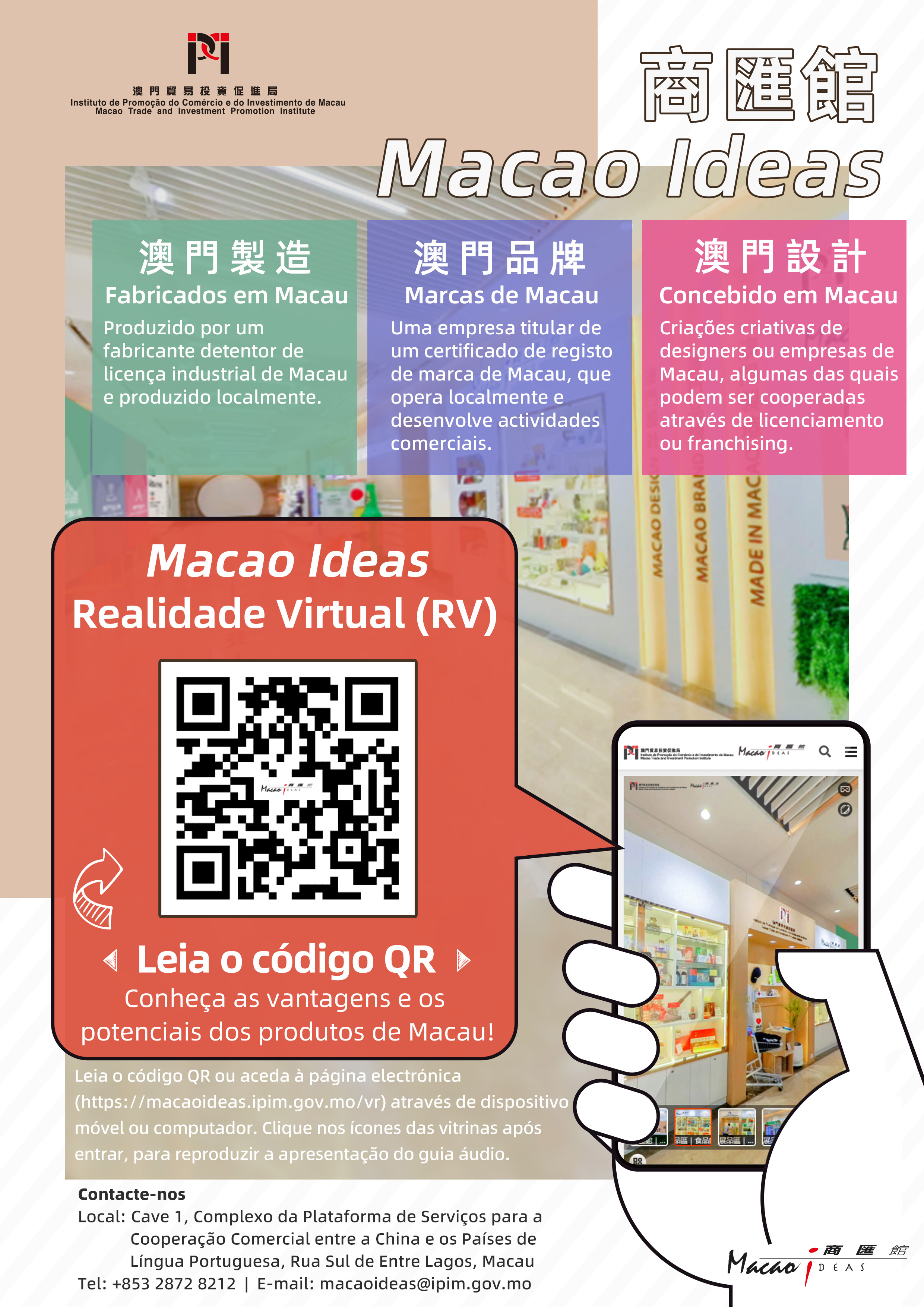 Foi completamente actualizada a página electrónica do Macao Ideas do Instituto de Promoção do Comércio e do Investimento de Macau (https://macaoideas.ipim.gov.mo/), que reúne mais de 100 empresas locais e cerca de 1.700 produtos “fabricados em Macau”, de “marcas de Macau” e “concebidos em Macau”. Com base no conteúdo multimédia, acrescentaram-se principalmente: a exibição online de realidade virtual (RV), a pesquisa optimizada por palavras-chave, a função de partilha com um clique para plataformas de redes sociais, entre outros. Deste modo, ajuda-se os comerciantes nacionais e internacionais a conhecer os produtos de boa qualidade de Macau num sítio único e de uma forma conveniente, poupando tempo.