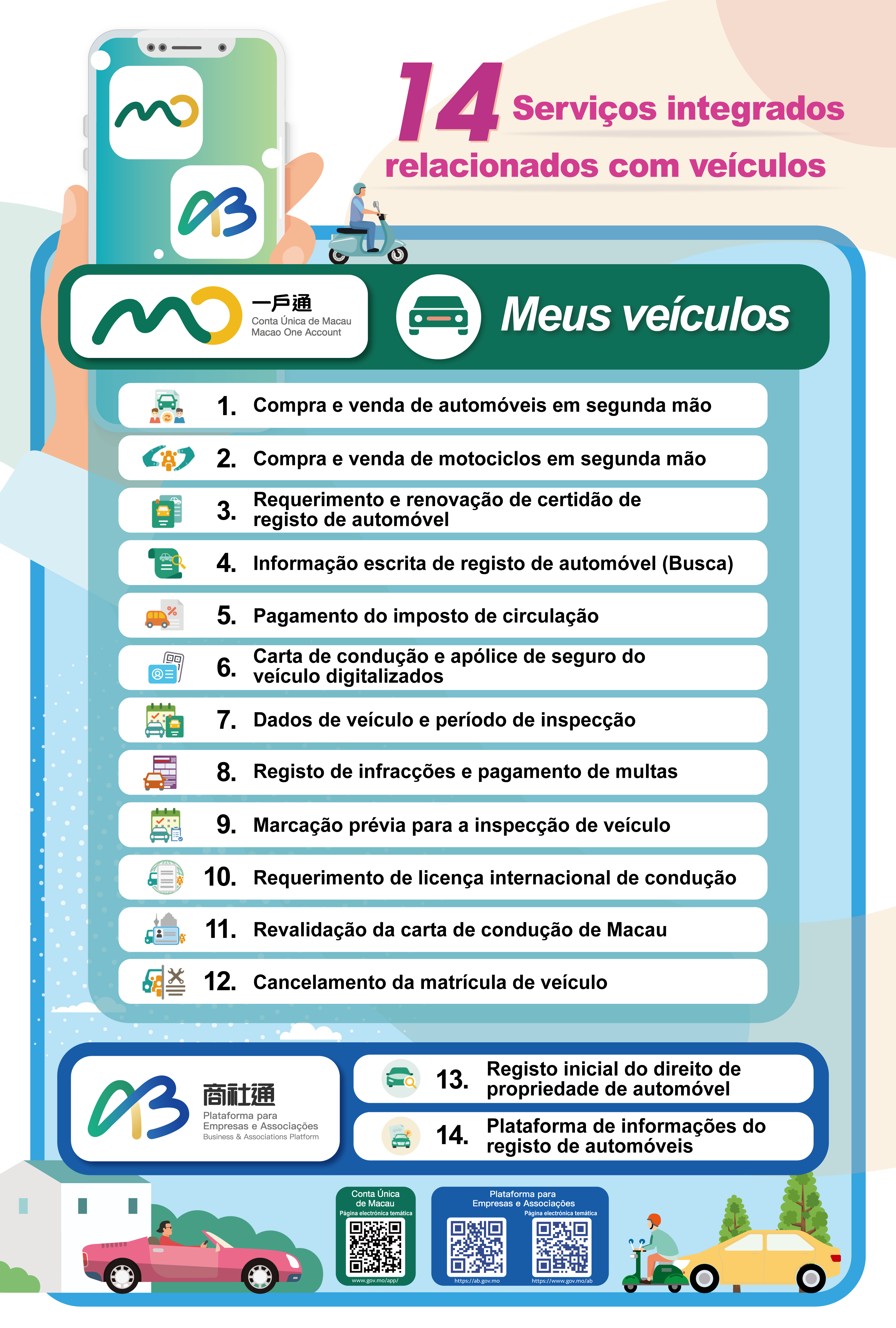 Na Conta Única são prestados, de forma integrada, os seguintes 12 serviços: compra e venda de automóveis em segunda mão, compra e venda de motociclos em segunda mão, requerimento e renovação de certidão de registo de automóvel, informação escrita de registo de automóvel (busca), pagamento do imposto de circulação, carta de condução e apólice de seguro do veículo digitalizados, dados de veículo e período de inspecção, registo de infracções e pagamento de multas, marcação prévia para a inspecção de veículo, requerimento de licença internacional de condução, revalidação da carta de condução de Macau e, também, cancelamento da matrícula de veículo. Paralelamente, estão disponíveis na Plataforma para Empresas e Associações dois serviços integrados: o registo inicial do direito de propriedade de automóvel e a plataforma de informações do registo de automóveis.