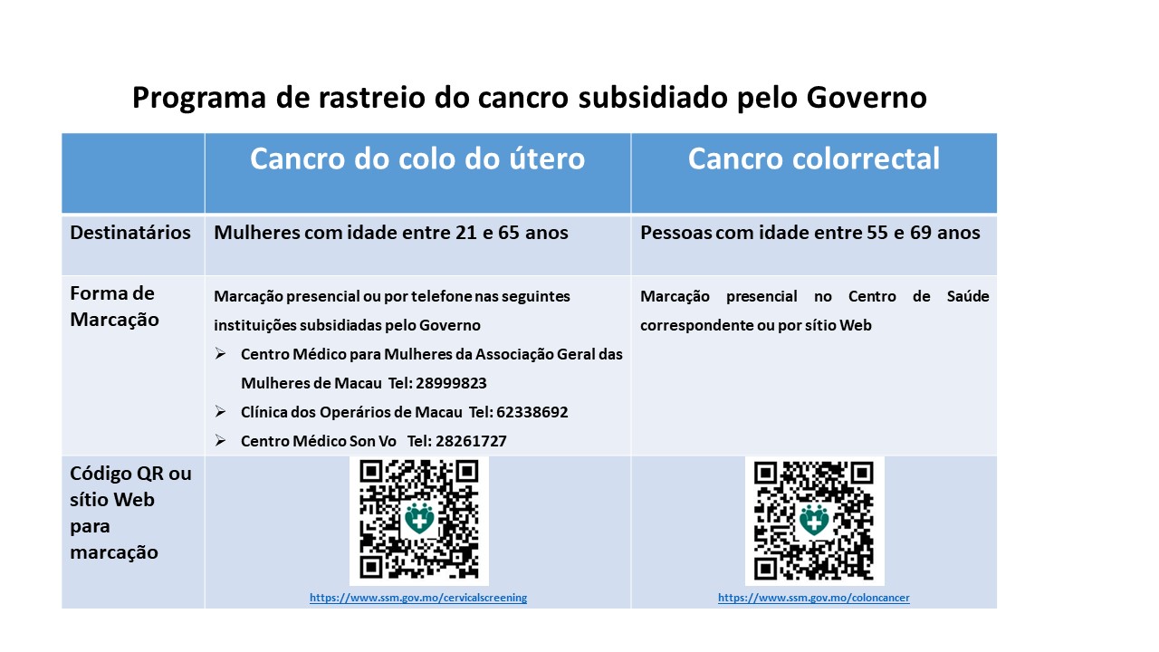 A par disso, a partir de 2016, os Serviços de Saúde lançaram o serviço de marcação prévia online para o rastreio do cancro colorrectal, a fim de facilitar os residentes e reduzir o tempo de espera, estes Serviços colaboram com as instituições médicas privadas, concedendo subsídios aos participantes com resultado positivo no sangue oculto para realização de colonoscopia nas instituições médicas de Macau. Até ao presente momento, foram concluídos 23 mil testes laboratoriais, entre os quais, 2 462 pessoas necessitaram de fazer colonoscopia por causa de resultado positivo no teste sangue oculto. No total, foram diagnosticados 139 casos de doentes com cancro colo-rectal, tendo-lhes sido providenciado acompanhamento e tratamento atempado.