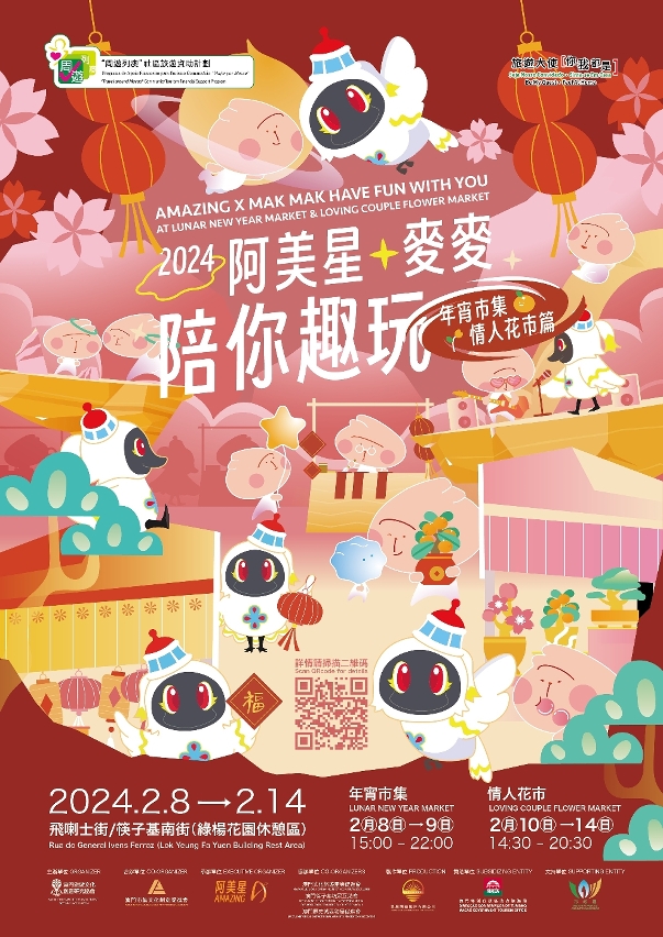 A actividade “Venham divertir-se com Amazing e Mak Mak na Feira do Ano Novo Lunar e na Feira de Flores dos Apaixonados”, que tem como tema “Amazing x Mak Mak”, com propriedade intelectual original local, em conjugação com o ambiente festivo do Ano Novo Lunar e do Dia dos Namorados, organizará nos dias 8 a 14 de Fevereiro, na Zona de Lazer do Edifício Lok Yeong Fa Yuen na Zona Norte Fai Chi Kei, a Feira do Ano Novo Lunar (8 e 9 de Fevereiro, das 15h00 às 22h00) e a Feira de Flores dos Apaixonados (10 a 14 de Fevereiro, das 14h30 às 20h30). No total, serão instalados mais de 50 stands criativos e um castelo insuflável temático de grande dimensão do planeta Amazing, para celebrar a chegada do Ano Novo Lunar com os residentes e visitantes, criando um ambiente festivo, alegre e acolhedor.