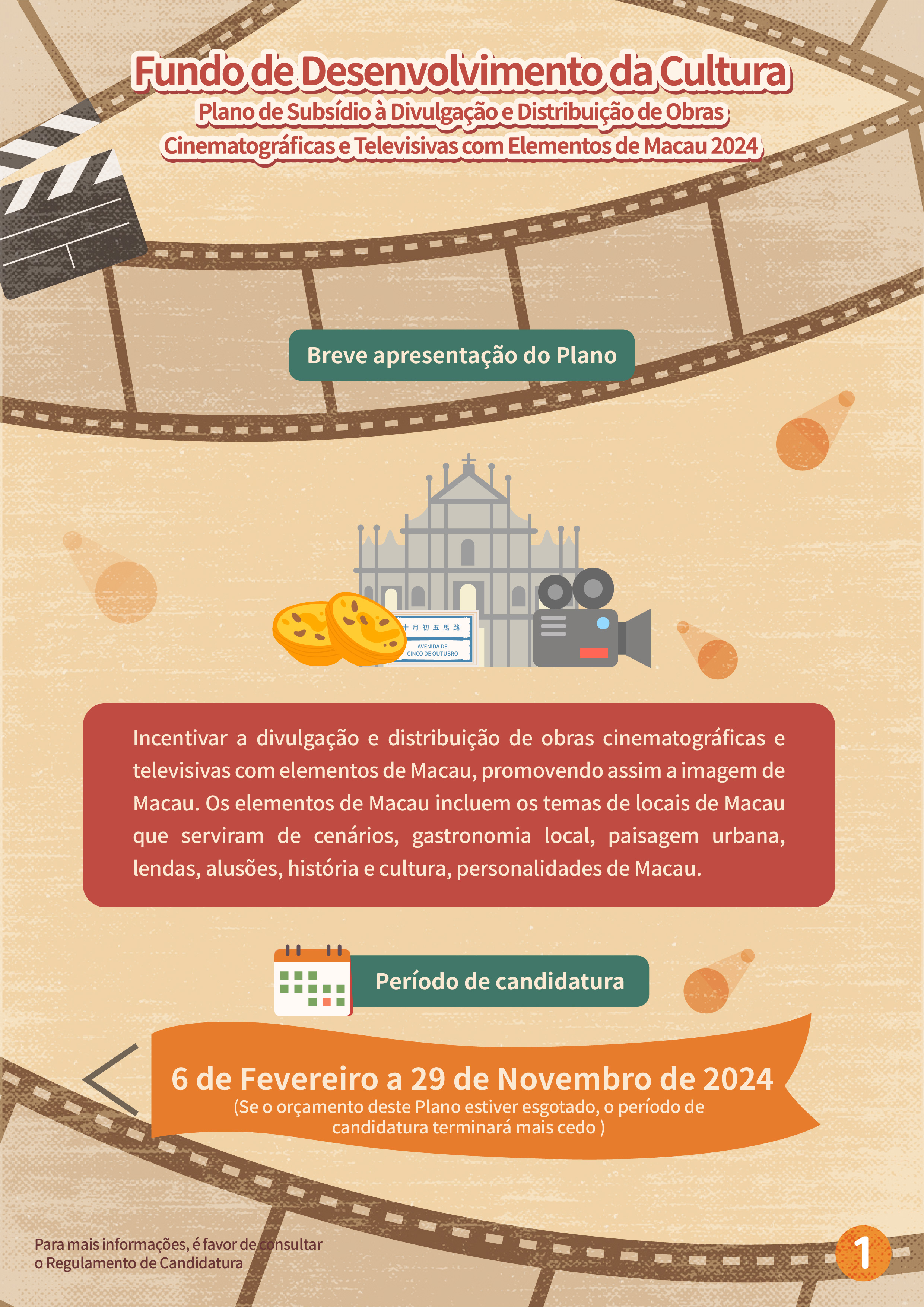 O Fundo de Desenvolvimento da Cultura (FDC) lança o “Plano de subsídio à divulgação e distribuição de obras cinematográficas e televisivas com elementos de Macau” e o “Plano de subsídio à filmagem cinematográfica e televisiva em Macau”, visando apoiar a entrada de obras cinematográficas e televisivas com elementos de Macau no mercado, reforçar a promoção da imagem da cidade e aumentar a reputação internacional de Macau, impulsionar a ligação entre a criatividade cultural e o turismo, bem como, promover o desenvolvimento da indústria cinematográfica e televisiva de Macau.