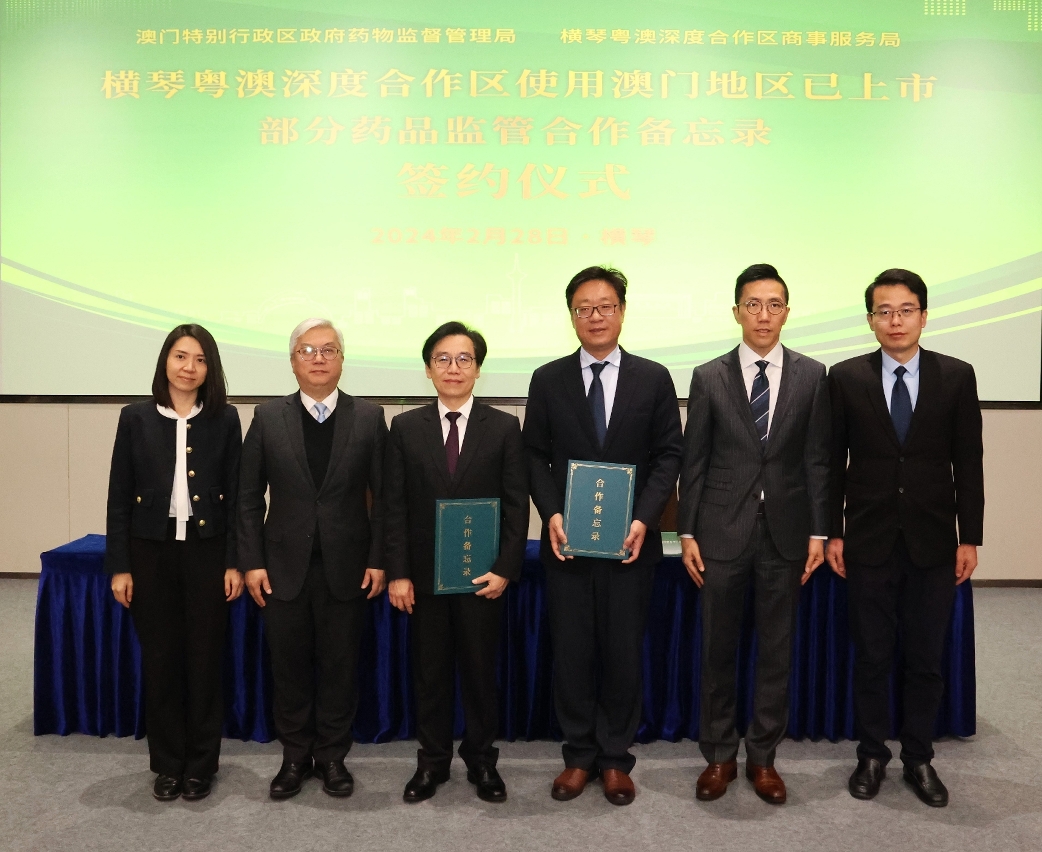 O Instituto para a Administração e Supervisão Farmacêutica (ISAF) assinou hoje (dia 28), em Hengqin, o “Memorando de cooperação sobre a supervisão e administração do uso de alguns medicamentos já vendidos em Macau na Zona de Cooperação Aprofundada entre Guangdong e Macau em Hengqin” (doravante designado “Memorando”) com a Direcção dos Serviços de Assuntos Comerciais da Zona de Cooperação Aprofundada entre Guangdong e Macau em Hengqin e realizou uma reunião de trabalho para discutir a concretização de trabalhos referentes ao “Memorando”.