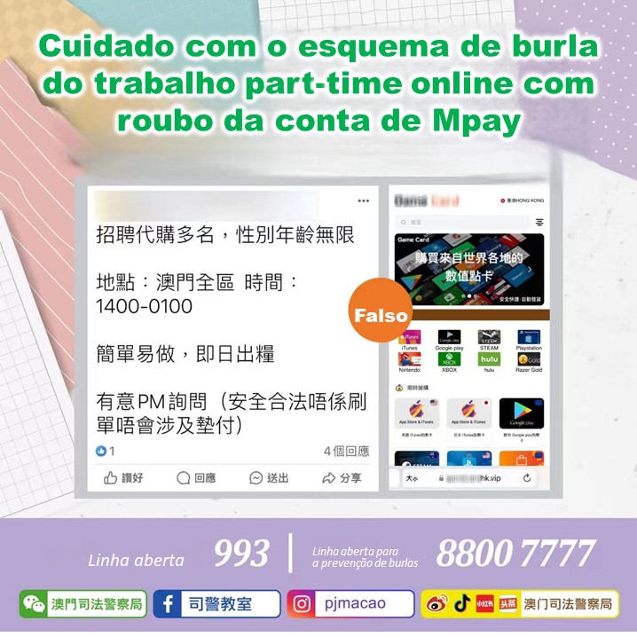Nos últimos dias, a Polícia Judiciária recebeu várias denúncias de cidadãos que, através de plataformas de redes sociais, se candidataram a empregos part-time de “compra de cartões de pontos”. Inicialmente, estes conseguiram ganhar uma pequena comissão, mas, mais tarde, ao descobrirem que os fundos da sua conta MPay tinham sido roubados, perceberam então que foram enganados com perdas que variam de alguns mil a várias dezenas de milhares.