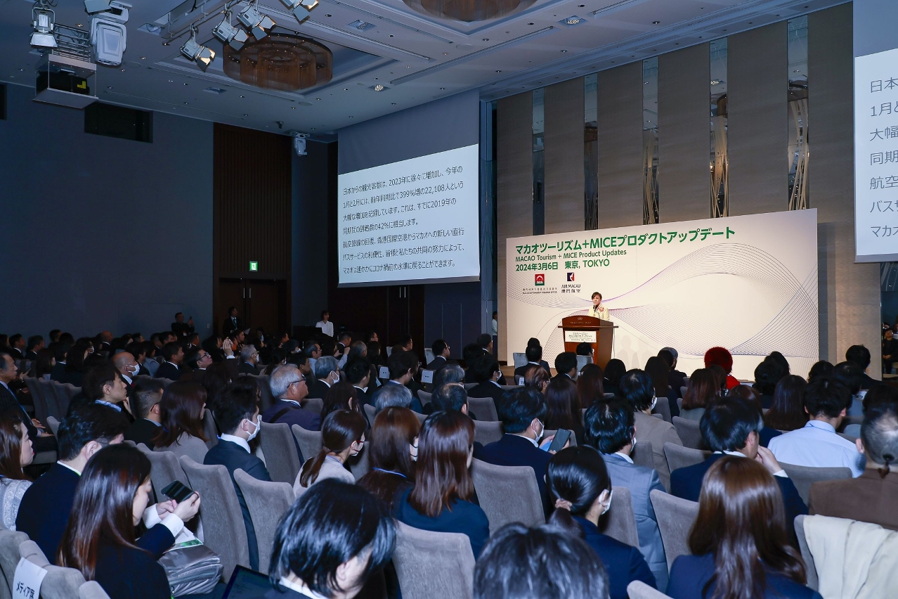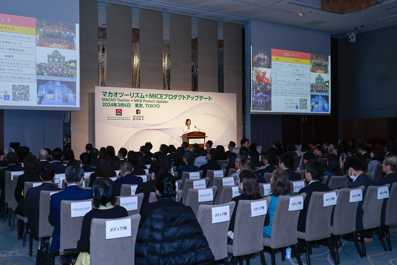 O “Seminário de Actualização de Produtos de Turismo + Convenções e Exposições de Macau e Bolsa de Contactos” realizou-se hoje (dia 6), no Palace Hotel Tokyo. A ocasião contou com a presença da directora da DST, Maria Helena de Senna Fernandes, do director executivo do Escritório de Turismo Internacional da Associação Japonesa de Agentes de Viagens, Kazuhiro Ito, do vogal executivo do Conselho de Administração do Instituto de Promoção do Comércio e do Investimento de Macau (IPIM), Sam Lei, do chefe da Divisão de Cultura, Turismo, Convenções e Exposições e Comércio da Direcção dos Serviços de Desenvolvimento Económico da Zona de Cooperação Aprofundada entre Guangdong e Macau em Hengqin, Vic Lam, do director-geral adjunto – Japão e director geral executivo – Osaka da Air Macau Company Limited, Ringo Chan, entre outros convidados, em conjunto com operadores da indústria turística e das seis grandes empresas integradas de turismo e lazer de Macau, num total de mais de 210 participantes.