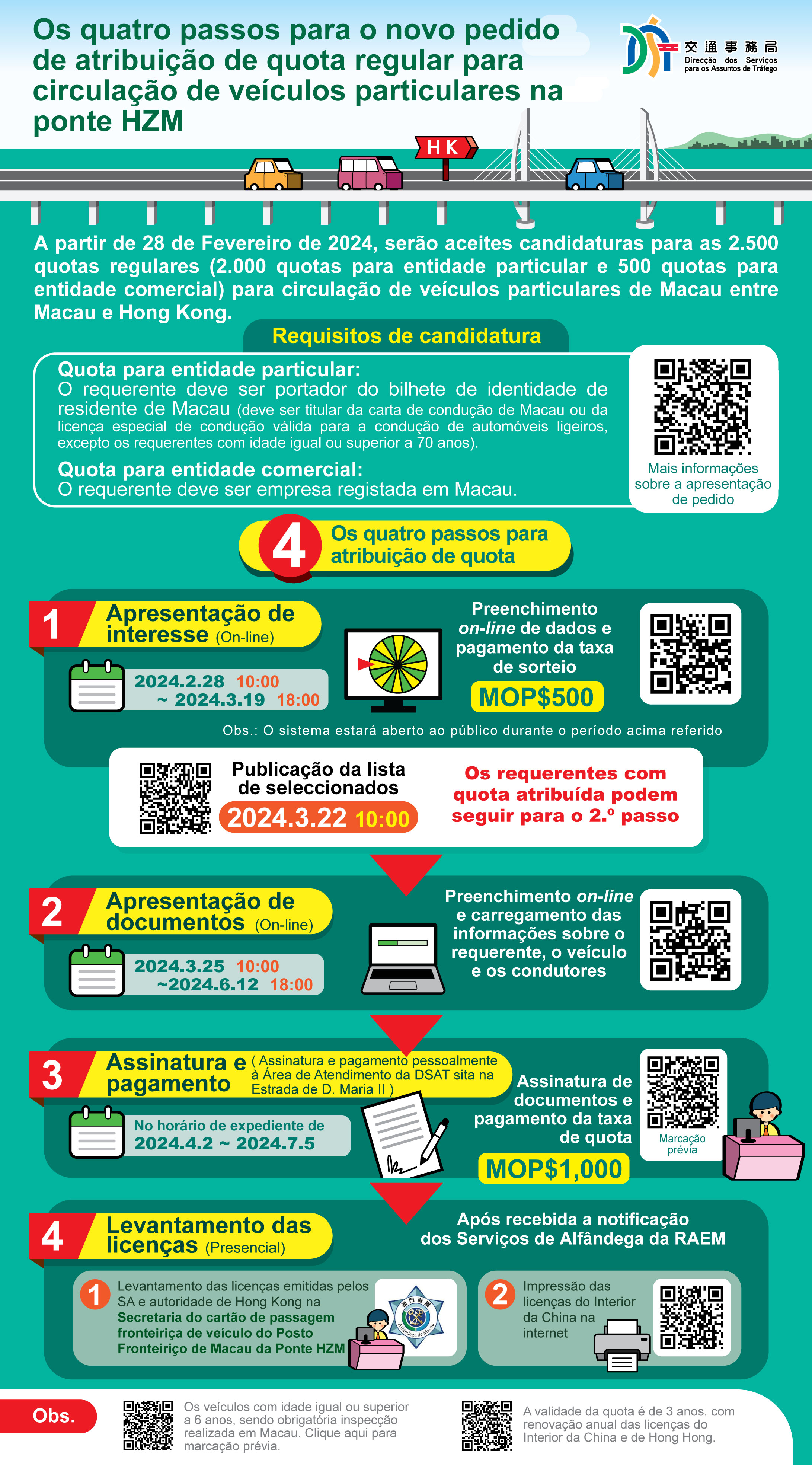 A inscrição para atribuição de 2.500 quotas regulares (2.000 para entidade particular e 500 para entidade comercial) para circulação de veículos particulares de Macau entre Macau e Hong Kong do ano 2024 foi lançada no dia 28 de Fevereiro do corrente ano e terminada no dia 19 de Março. Durante esse período, a Direcção dos Serviços de para os Assuntos de Tráfego (DSAT) recebeu um total de 21.429 pedidos de manifestação de interesse, dos quais 18.544 são particulares e 2.885 comercias). Foi tornada pública, via o seguinte website, a lista de requerentes ordenados por sorteio informático https://www.dsat.gov.mo/hzmb/car_cross_2024.aspx.