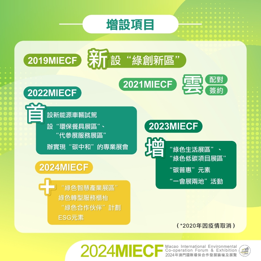 Todos os anos, o MIECF introduz novos elementos com o intuito de contribuir para a promoção das políticas ambientais e do desenvolvimento da economia verde do país e da RAEM e para a construção de uma plataforma de intercâmbio e cooperação verde. Por exemplo, o 2019MIECF criou a “Zona de Inovação Verde”, em prol das tecnologias verdes inovadoras e do empreendedorismo dos jovens. Em 2021, por força da pandemia, as bolsas de contactos online e as sessões online de assinatura de protocolos ajudaram a explorar as oportunidades de negócios verdes. Em 2022, o estabelecimento da “Zona de Exposição de Artigos Ecológicos de Mesa” e a oferta de test-drives de veículos movidos a novas energias foram iniciativas que visaram responder às políticas ambientais do Governo da RAEM. Por fim, em linha com a “Dupla Meta de Carbono” nacional, o MIECF tornou-se a primeira exposição profissional em Macau a alcançar a “neutralidade de carbono”, graças à adopção de medidas como o cálculo da emissão de carbono e a compensação da pegada de carbono.