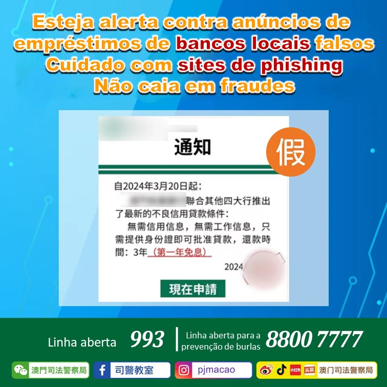 Recentemente, a Polícia Judiciária recebeu uma denúncia de um banco local, indicando que alguém estava a usar indevidamente o nome deste banco em plataformas de redes sociais para divulgar postagens publicitárias falsas de empréstimos. Alegavam ainda esses posts que o banco tinha lançado "novas condições de empréstimo para crédito malparado", incentivando os interessados a clicar em links contidos no anúncio para fazerem a aplicação. Ao fazer-se o clique nos referidos links, salta-se para outra página contendo várias postagens publicitárias de empréstimos, incluindo de bancos das regiões vizinhas e outros sites de empréstimos de origem duvidosa. No entanto, os sites vinculados a esses anúncios estão constantemente a mudar, pelo que deixam dúvidas quanto à sua autenticidade.